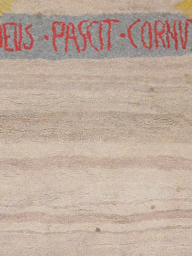 An antique American Hook Rug. This is a hooked armorial rug with an ivory field displaying a winged and helmed coat of arms above the Latin banderole “Deus Pascit Cornutos” (“God … Horns”). Beneath are four additional smaller shields of arms indicating the ancestry of the bearer.