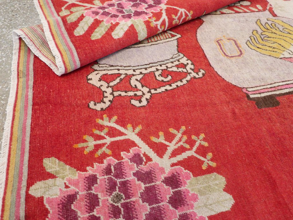 A wool pile of asymmetric knots on a cotton foundation. The cardinal red field depicts a still life of dishes on stands, ceramic vessels, and a scholar’s rock, all adorned with Buddha’s hand citron and various florets on stems. Tree peonies are featured in the corners, and a string border frames the composition.