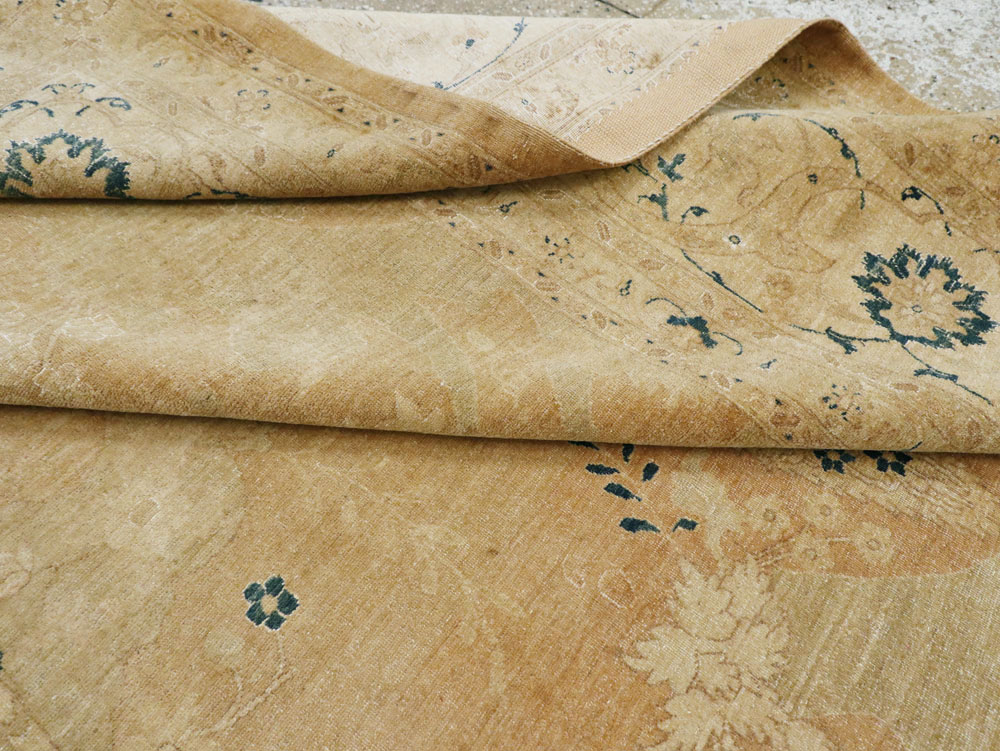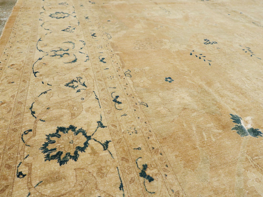 An antique Persian Tabriz carpet. Two beige cypresses softly emerge from the salmon ground below emphatic dark brown floral rough-edged ellipses. A few dark brown and ecru flowers flank the cypresses. The beige border displays palmettes, saz leaves, and several arabesque vine layers.