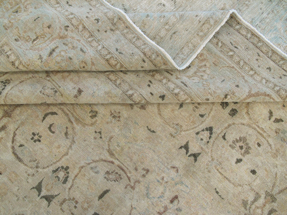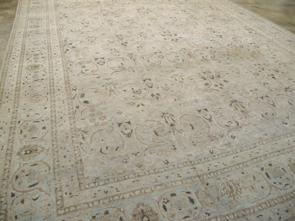 An antique Persian Tabriz carpet. Paired large volute vines drive the pattern on this light beige ground NW Persian city carpet. Small palmettes and hide-and-seek flowers add to the visual intrigue. The light field looks even bigger than the already generous carpet dimensions. The fleshy beige border presents more volute vine pairs.