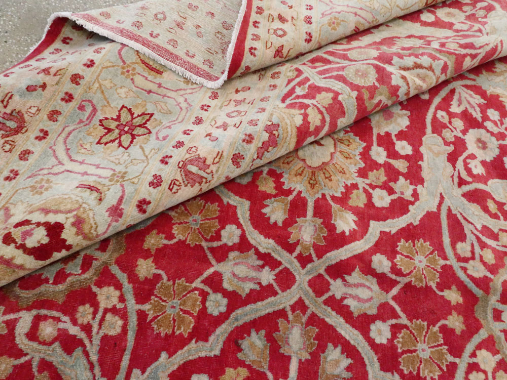 An antique Persian Tabriz carpet. The chocolate field of this extremely well-drawn NW Persian urban large carpet presents a bold forked arabesquerie creating asymmetric spaces for the lazy palmettes and smaller rosettes. The pale grey-blue main border displays smaller forked arabesques, rosettes and palmettes. Goldenrod is a major accent tone.