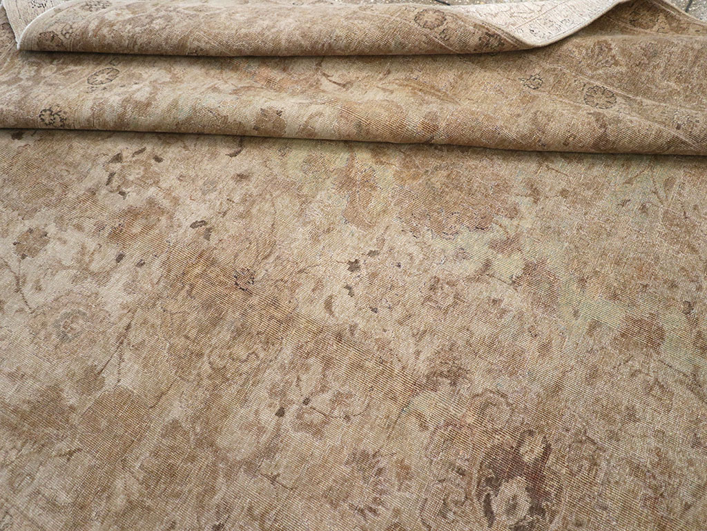 A wool pile of symmetric knots on a cotton foundation. In a generally light-toned palette, this small city carpet features a sandy field with a close scatter of bracketed and other palmettes, along with leaves, accented in dark brown. Cloud bands, scalloped rosettes, and ragged palmettes appear in the continuous border, which includes oblique corner devices.