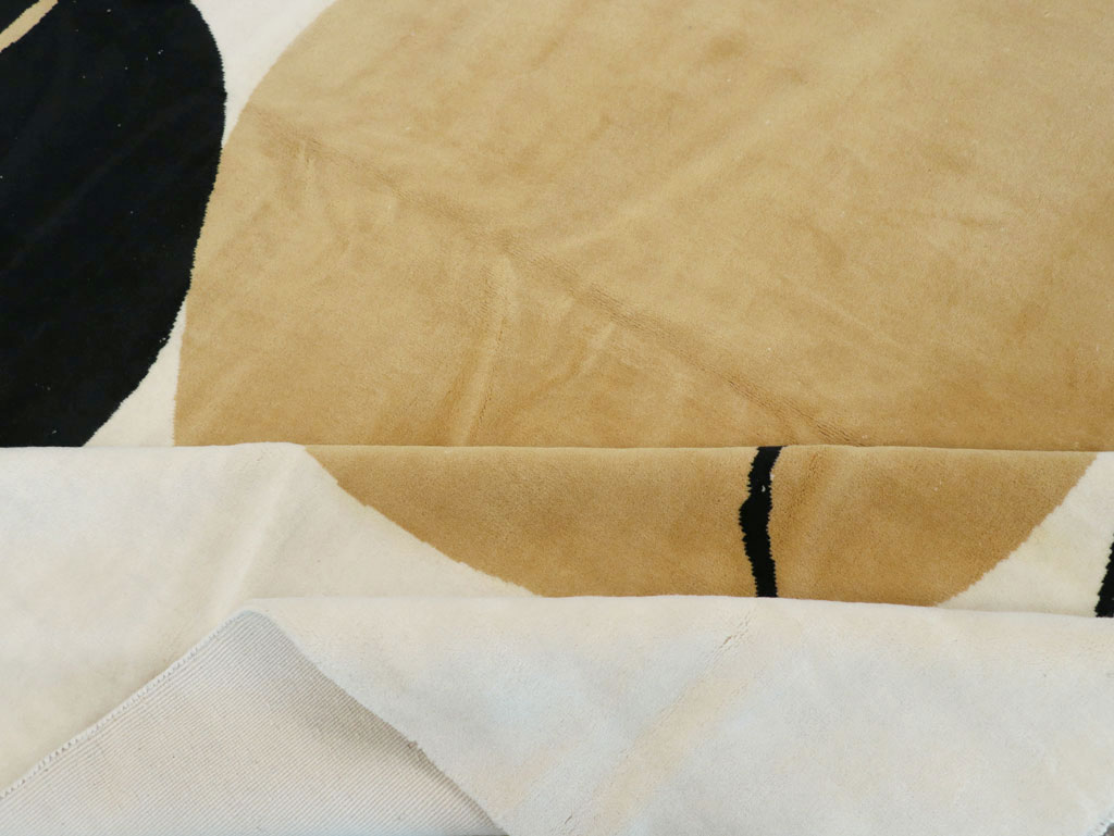 A wool pile of symmetric knots on a cotton foundation. The borderless ecru field shows two giant, irregular discs in dark brown and rusty apricot, two partially overlapping circles, and a small dot, in an asymmetric, off-center layout. Everything floats and wobbles. Works perfectly with 60’s Pop Art.