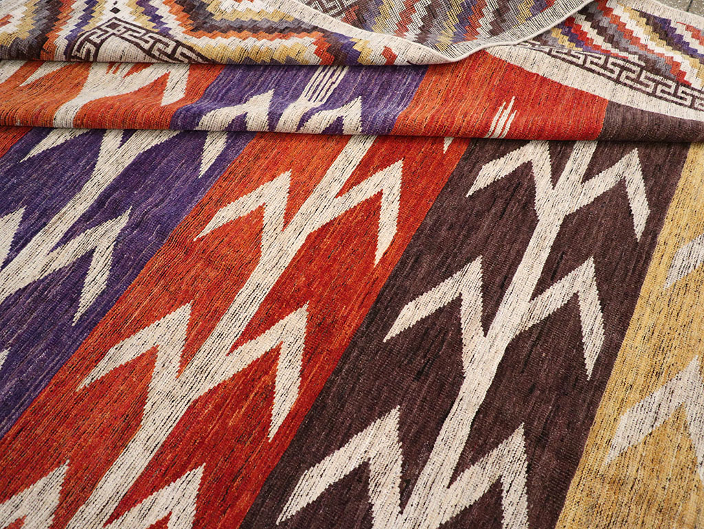 A wool pile of asymmetric knots on a cotton foundation. Stylized slender plants grow from right to left across a paneled, abrashed field in red, yellow, green, dark blue, and medium blue. The colorful main border features diagonal stripes, while a narrow inner minor displays a T-fret pattern.