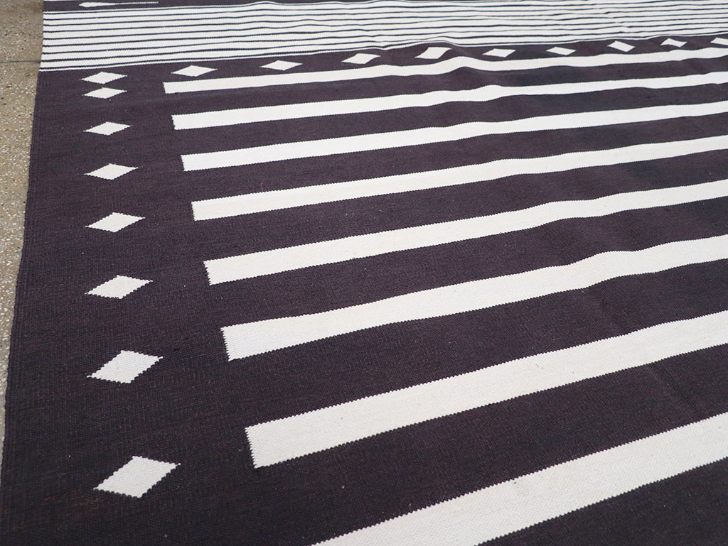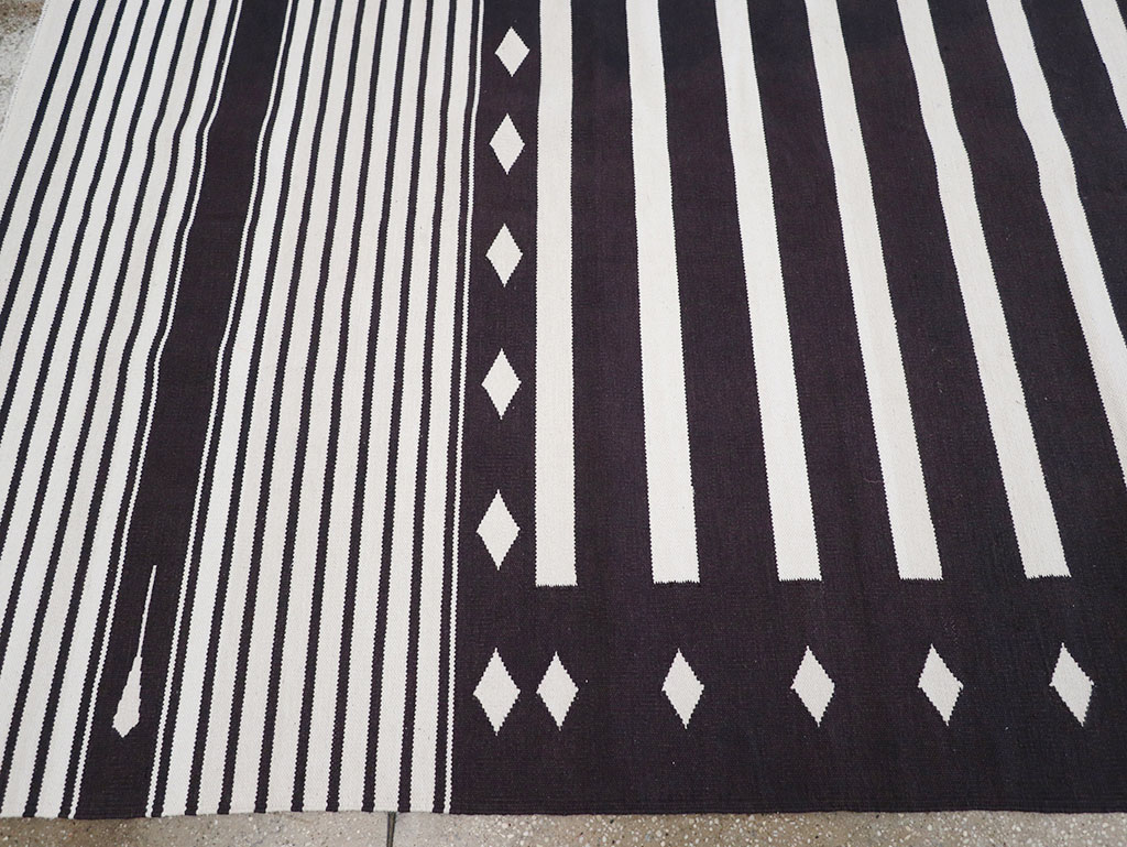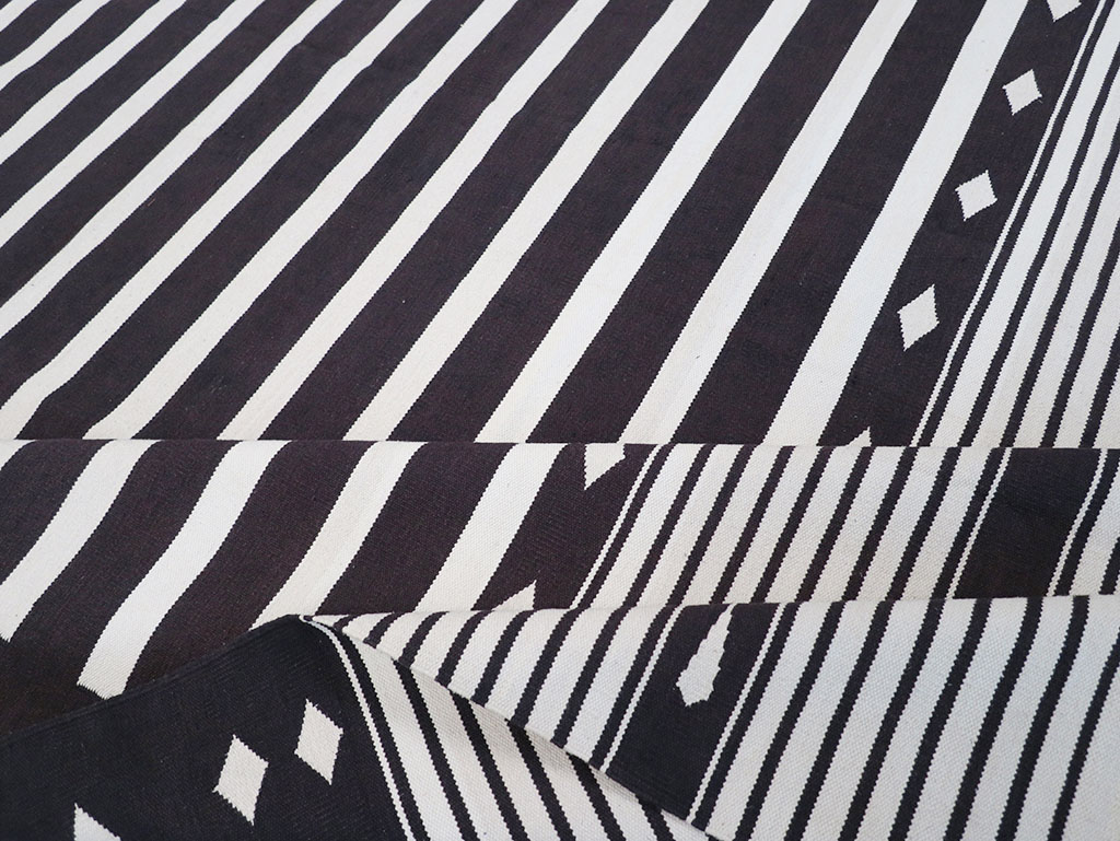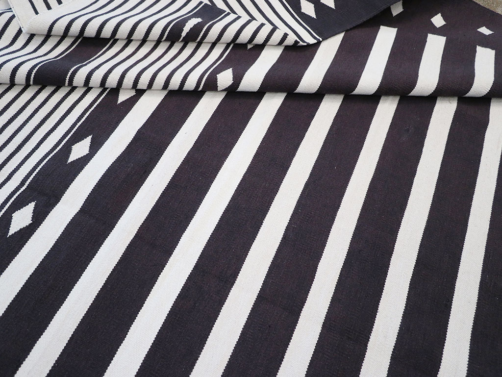 Cotton tapestry plainweave on cotton. A firm washboard of charcoal and off-white stripes occupies the central section, with small off-white accent lozenges along the implicit border. A wide charcoal band interrupts the off-white and charcoal pinstriped end panels.