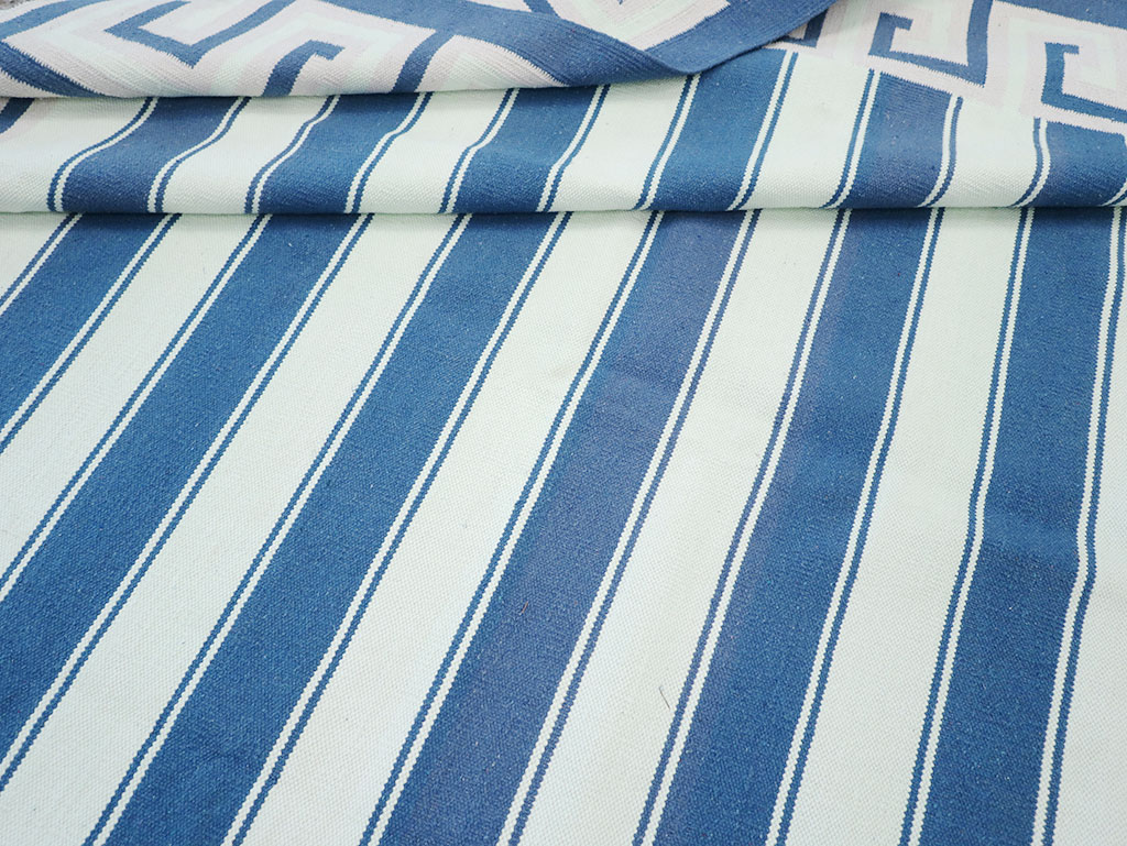 Cotton in tapestry weave. The blue-on-off-white angular Greek key hook border transitions into an off-white field with abbreviated denim blue bars. Finished with a narrow, integrated plain blue surround.