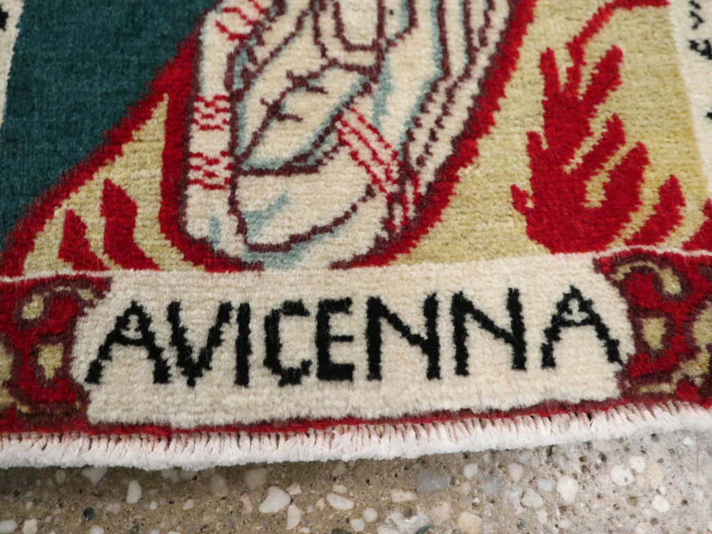 A wool pile of symmetric knots on a cotton foundation. A visual pair to rug # 28441. Taken from an iconic image of Avicenna, with a pale green robe and draped turban, he faces left on the dark ground. His name and achievements are detailed in the ecru cartouche border. Avicenna is the most important Persian scholar of the Middle Ages.