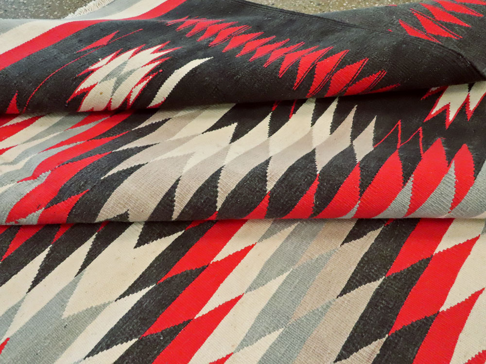 A vintage Indian Flat-weave Dhurrie carpet. A totally bold horizontal serrated zig-zag in red, black and ecru in the Navajo style keeps the eye moving on this Indian tapestry-woven flat carpet. The black main border displays ashiks separated by thin bars. The striking composition will dominate any room and contrast with any type of furnishings.