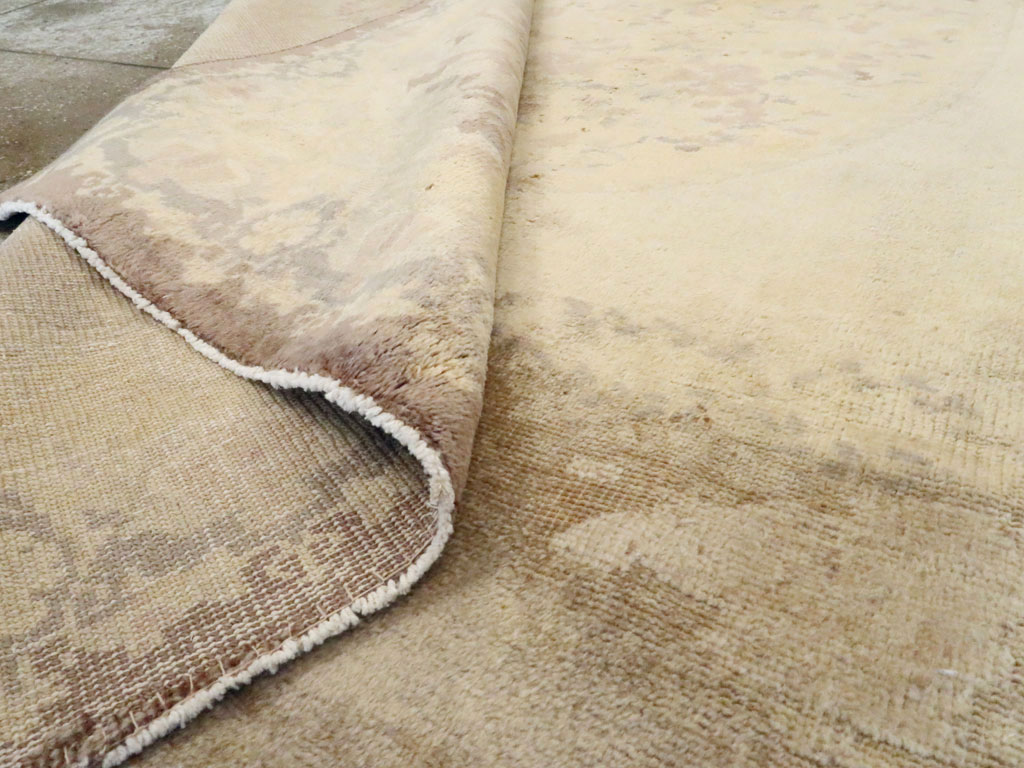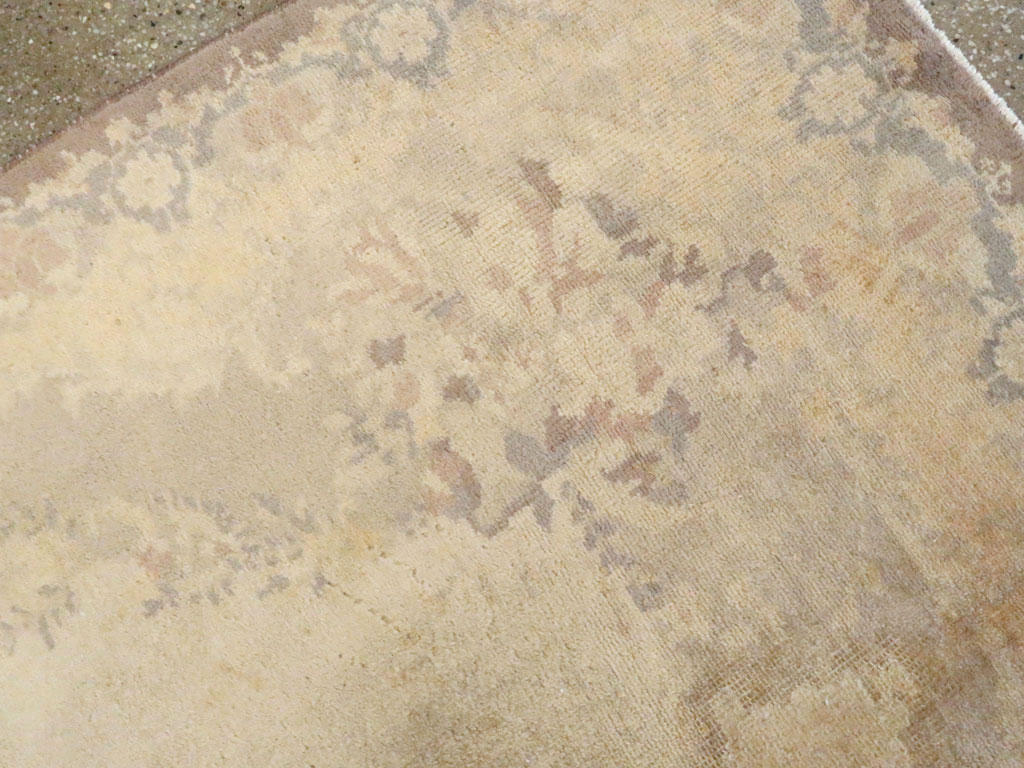 A vintage Indian Lahore rug. This pastel coloured northern Indian carpet has an ivory field centered by a tall, oval shadow medallion. The frothy palest blue wreath inner border is framed by a foliate lappet outer stripe. An unusual size with colors that go anywhere.
