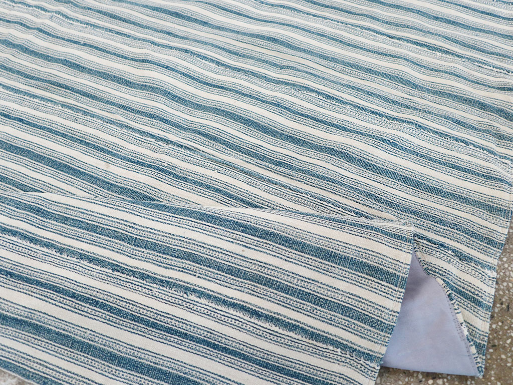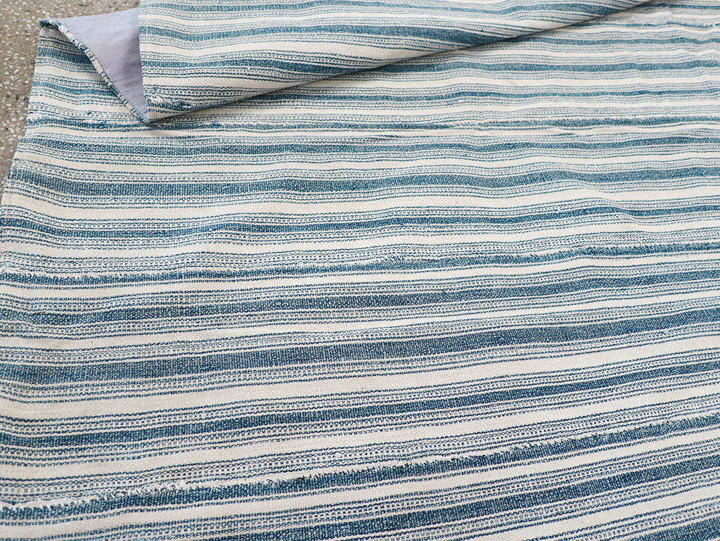 Wool warp-faced weave. Comfortable and striped like well-worn pajamas, this small cover or scatter rug features speckled slate upright bands, along with narrow solid and dotted lines in slate and ecru, arranged in similar stripes.