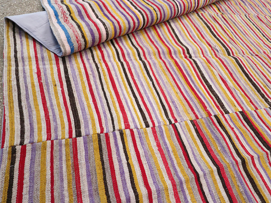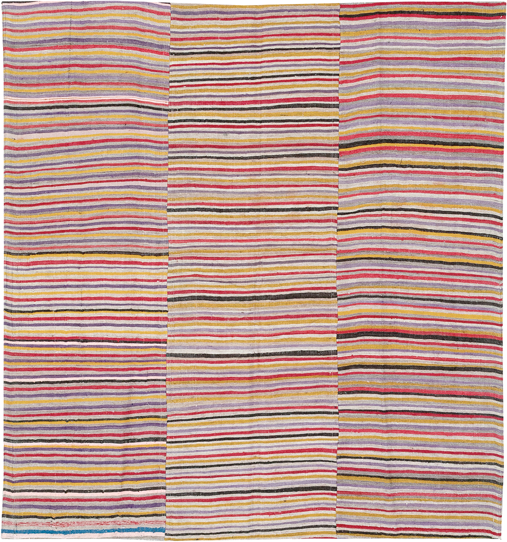 Wool weft-faced weave composed of three panels, asynchronously striped with narrow bands of lemon, old gold, red, cream, near-black, and light blue. A particularly colorful and cheerful example of the type. A visual pair to rug # 32921.