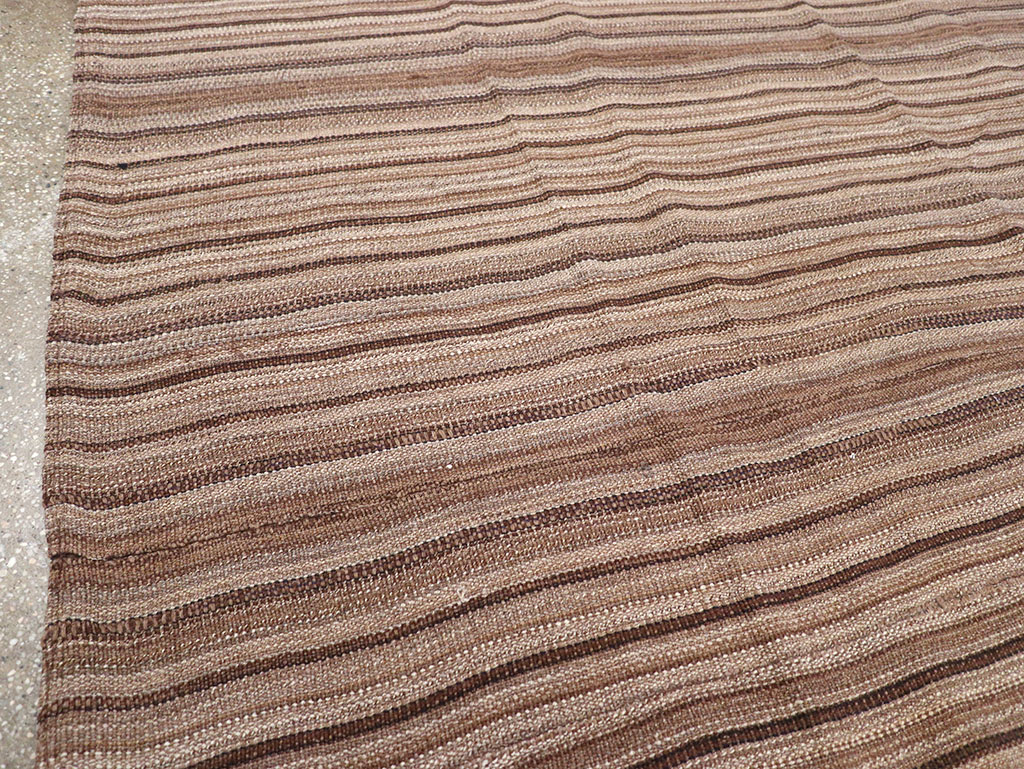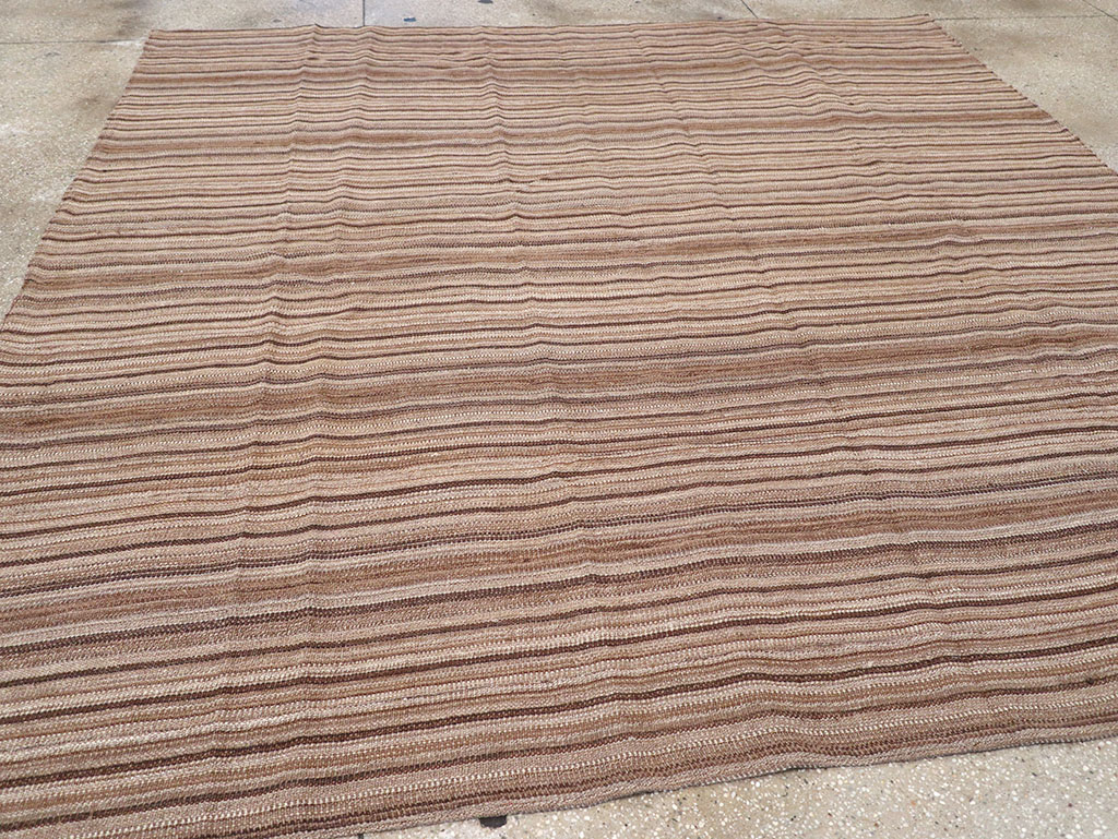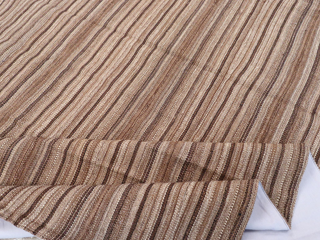 Wool warp-faced weave. The component sections are oriented horizontally, with a palette in the beige, tan, and brown range. There is a band pinch, but otherwise, it is in quite good condition. Lined and ready for use as a cover or carpet.