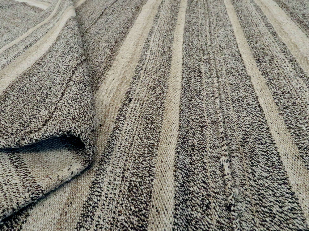 A vintage Persian Flatweave Rug. Banded in natural wool tones of beige, light brown, and umber, this versatile flatwoven rug is made in three edge-joined sections. There is no border and the layout is totally asymmetric. The sections can be rearranged or adjusted in size to suit the buyer.