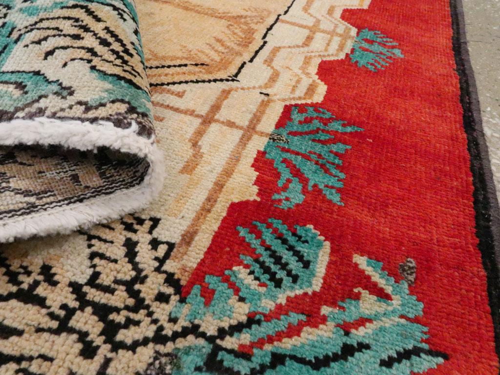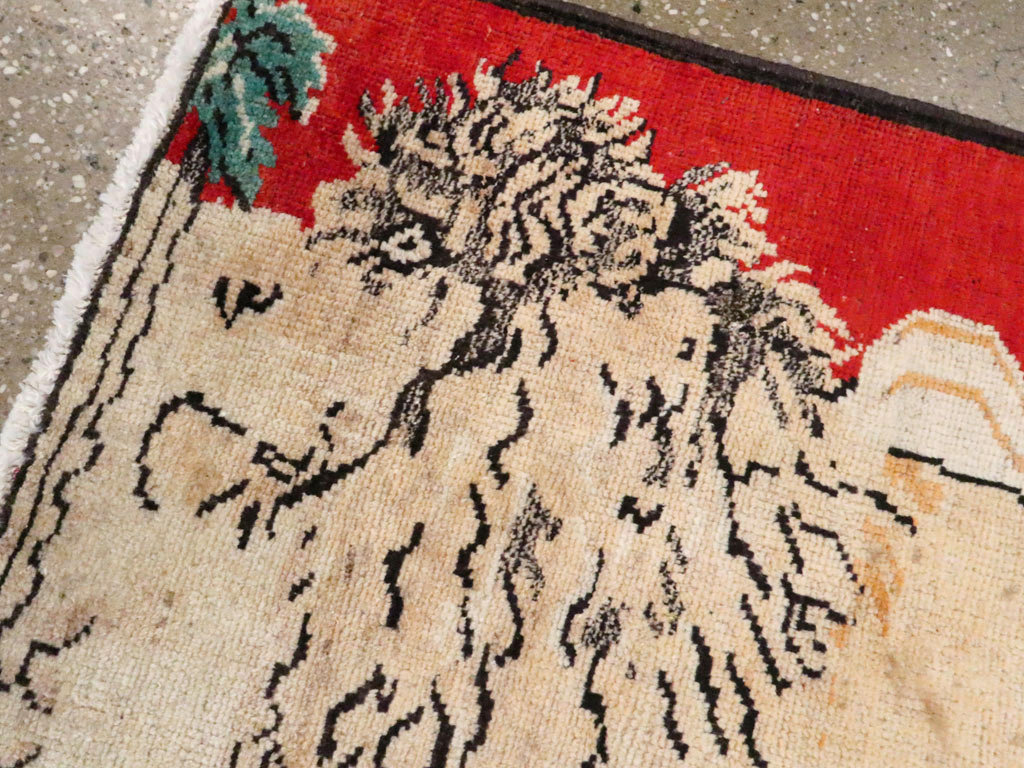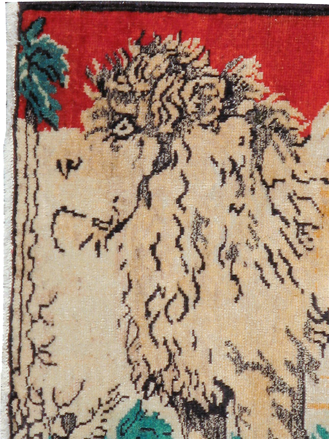 A vintage Persian Hamadan Pictorial rug. A visual pair to rug # 24659. In the background is a bright red sky, in the middle a sandy waste, and up front is a slender lion, maned, long-tailed and tawny, oriented leftwards and standing between palm trees with lesser foliage beneath him. The image may derive from a print, photograph or blanket. In Persia, the lion is almost totally extinct.