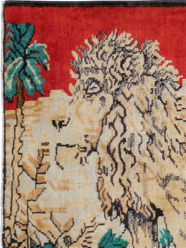 A vintage Persian Hamadan Pictorial rug. A visual pair to rug # 24658. In the background is a bright red sky, in the middle a sandy waste, and up front is a slender lion, maned, long-tailed and tawny, oriented leftwards and standing between palm trees with lesser foliage beneath him. The image may derive from a print, photograph or blanket. In Persia, the lion is almost totally extinct.