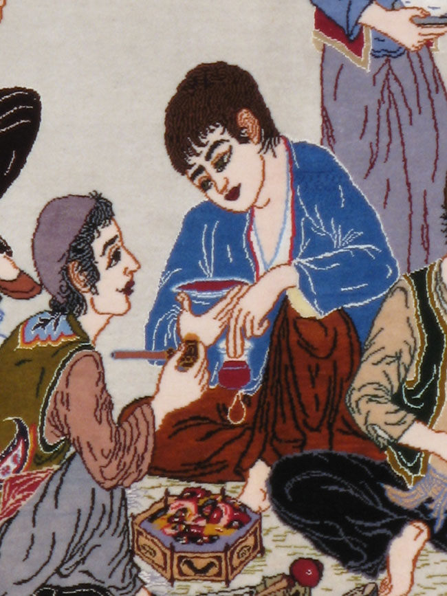 A vintage Persian Isfahan Pictorial rug. This interior scene depicts eleven male figures, possibly dervishes, taking an informal repast in a mosque. A lamp hangs from the apex of the arch behind the arabesque spandrels and associated columns. The main border cartouches depict scenes from around Isfahan, including the river bridge and this very finely woven, scatter is clearly a product of a professional Isfahan workshop. Inscription beneath.