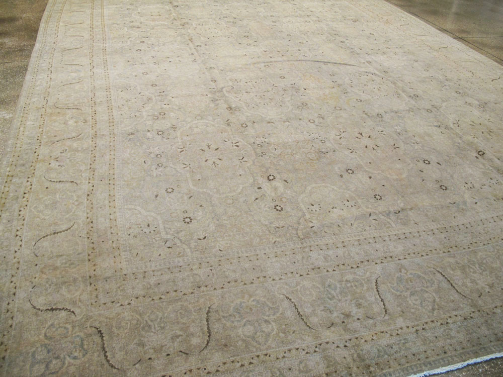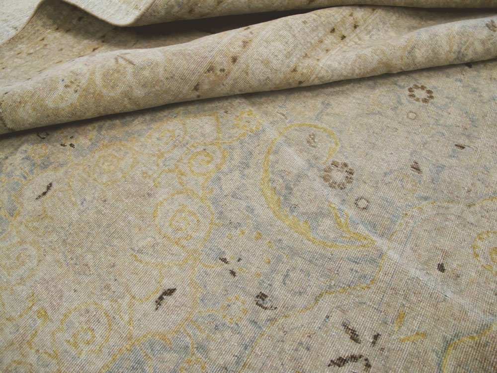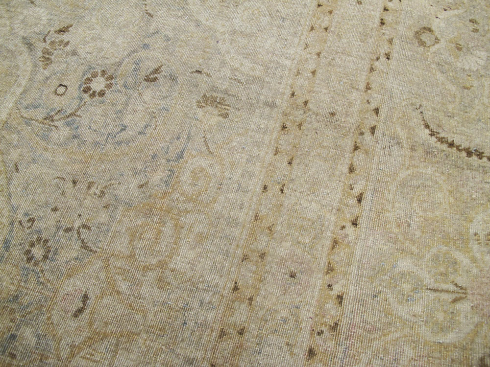 A vintage Persian Kashan carpet. Five full columns of lobed vertical cartouches are offset on an abrashed blue-grey to beige ground of this finely woven central Persian city carpet with detail tones in sand, buff and rust. The sandy border displays graceful, recurving leaves bracketing two types of palmettes.