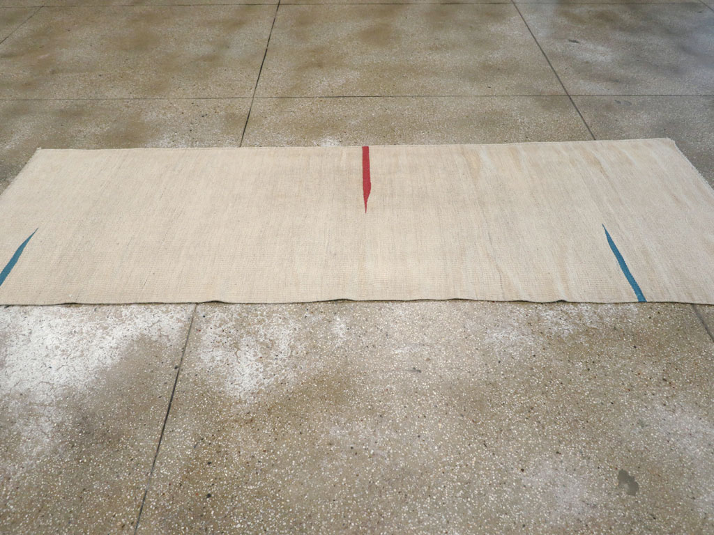 A vintage Persian Kilim. Three thin red, blue and green knifelike intrusions enter from the sides and reach halfway across the borderless ivory-beige field. This is modern minimalism attractively at work.