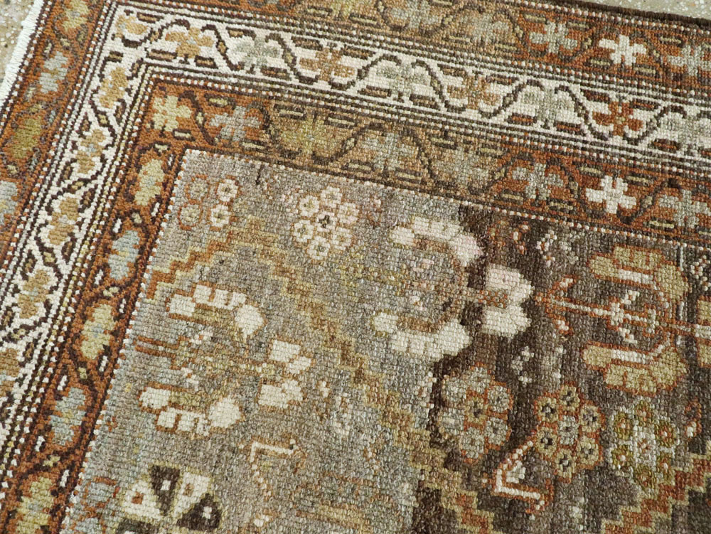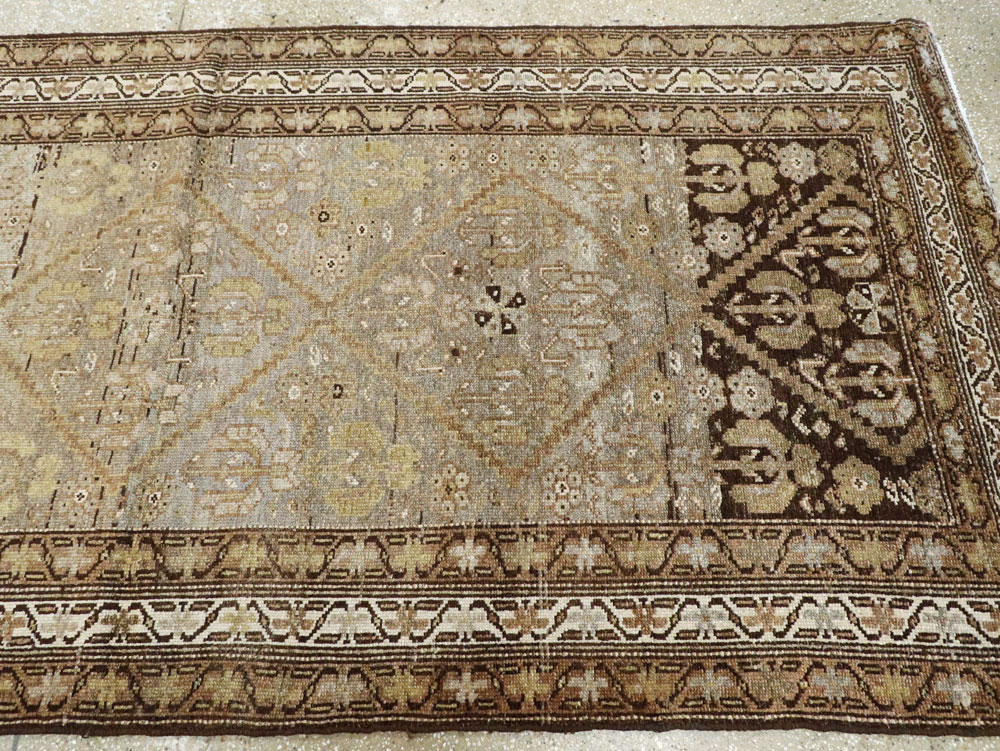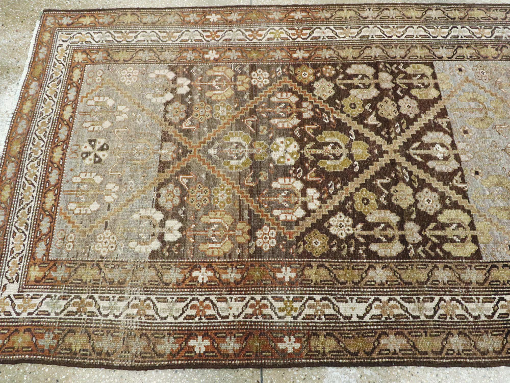 A vitnage Persian Kurdish runner. The radically abrashed dark brown to medium grey field of this west Persian Kurdistan village kenare displays a very large stepped lozenge pattern with each reserve enclosing flowers with drooping petals, lazy little botehs and small birds. The three equal width borders, the central one ivory, present reversing flowers and a meandering vine.