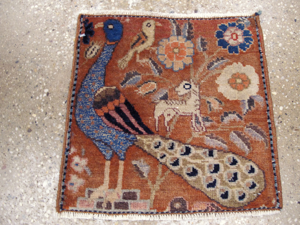 A wool pile of symmetric knots on a cotton foundation. A large, proud peacock face left, with a tail of “eyes” and speckled blue chest plumage. The rust coral ground also shows a smaller bird, a quadruped and three large bitonal rosettes. Narrowest of bitonal barber pole borders. A charming ruglet, perfect for a pillow.