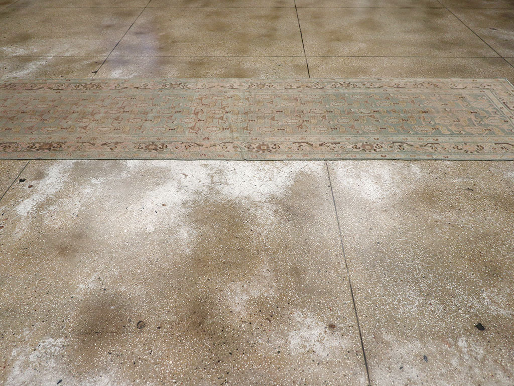 A wool pile of symmetric knots on a cotton foundation. A visual pair to rug # 32756. The grey powder field features an unusual pattern of alternating rows of upright and lazy botehs, with the former being floriated and the latter smaller and plain, creating an implicit gridwork. The straw-bone border is decorated with botehs, simplified turtles, rosettes, and palmettes.