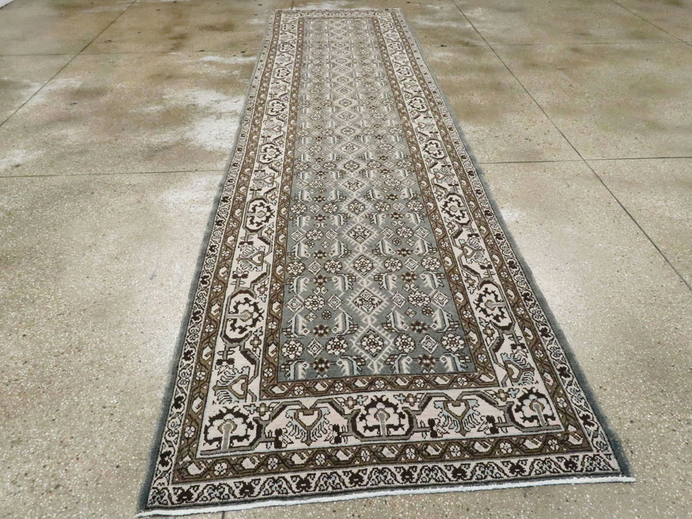 A wool pile of asymmetric knots on a cotton foundation. A vintage Persian Malayer runner. A visual pair to rug # 21377. This west Persian town runner displays an unusual version of the Herati pattern on its grey field: a chain of fringed lozenges runs the length of the field and pairs of slightly curved ‘fish’ leaves flank this backbone. A forked vine and flattened pyramidal palmettes decorates the old ivory main border.