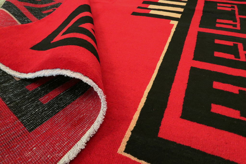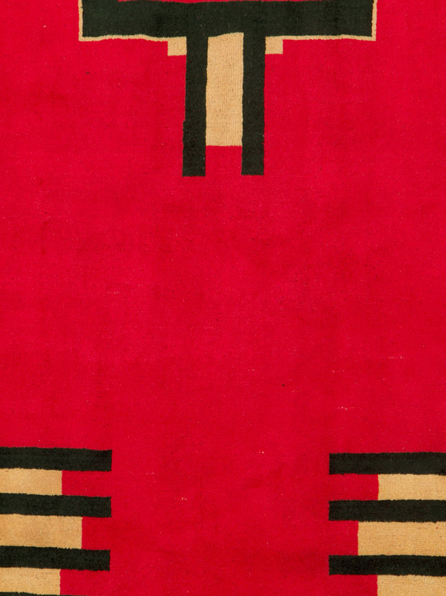 A vintage Persian Mashad Art Deco rug inspired by Edward McKnight Kauffer. All straight lines and right angles. Strong red and black. Cream accents. The quasi-border steps in along the ends and sides, and projects at the corners with a triple 90-degree angle. Powerfully direct with no fussiness. Requires proper Deco furniture.