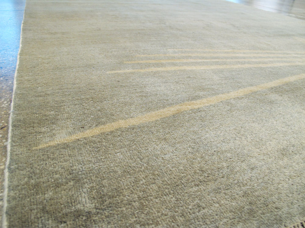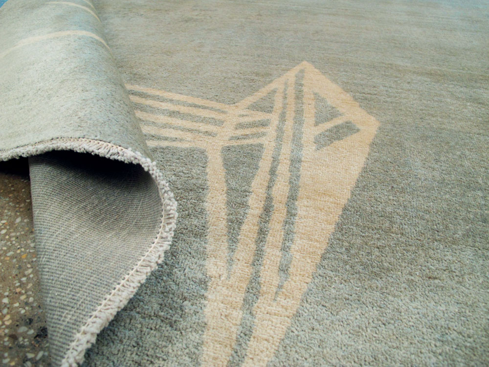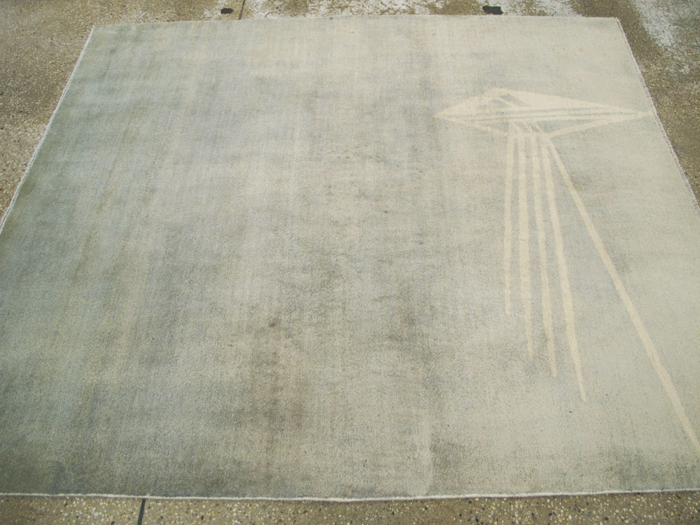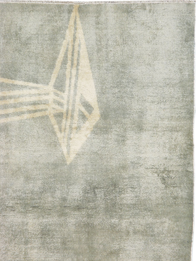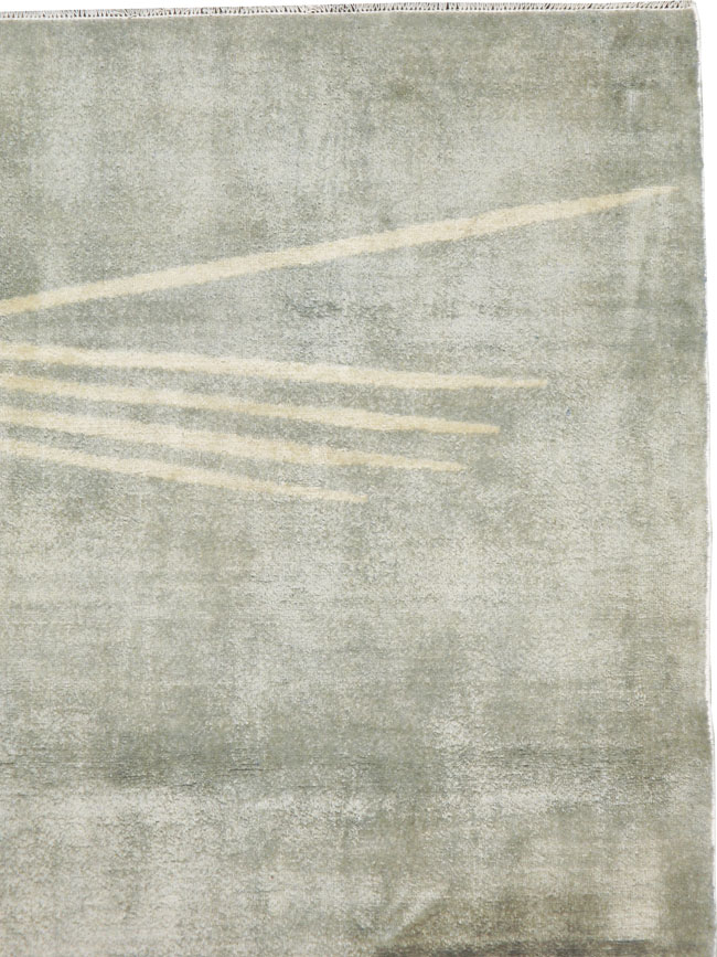 A vintage Persian Mashad Modernist rug. An ivory “flying saucer” emits rays on the otherwise plain, borderless jade field. This totally abstract city rug is minimalistic in its eschewal of extraneous pattern and modern in its restricted palette. Perfect as a contempo accent under a glass topped coffee table.