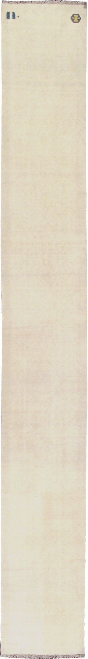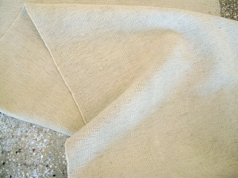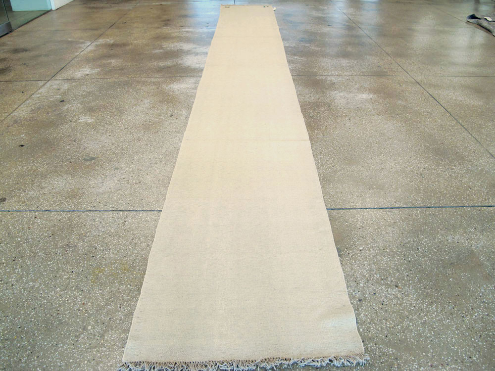 A vintage Persian Modernist kilim. This particularly narrow, almost totally plain flatwoven runner has only two spots of design on its beige field: two tiny dark brown geometric motives in the top two corners. The narrow format and neutral tonality make it useful in Contempo passageways.
