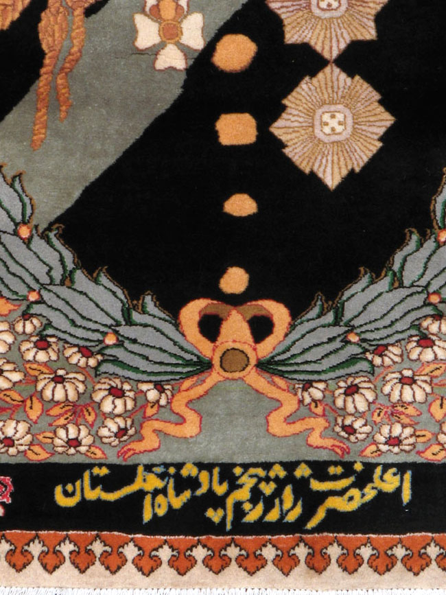 A vintage Persian Tabriz Pictorial rug. A royal male figure, King George V, is portrayed in bust-length facing front wearing a uniform around with badges and medals, within a floral wreath frame. The plain black background emphasizes the regality of the figure. A perfect wall piece for British monarchists. Inscribed beneath.