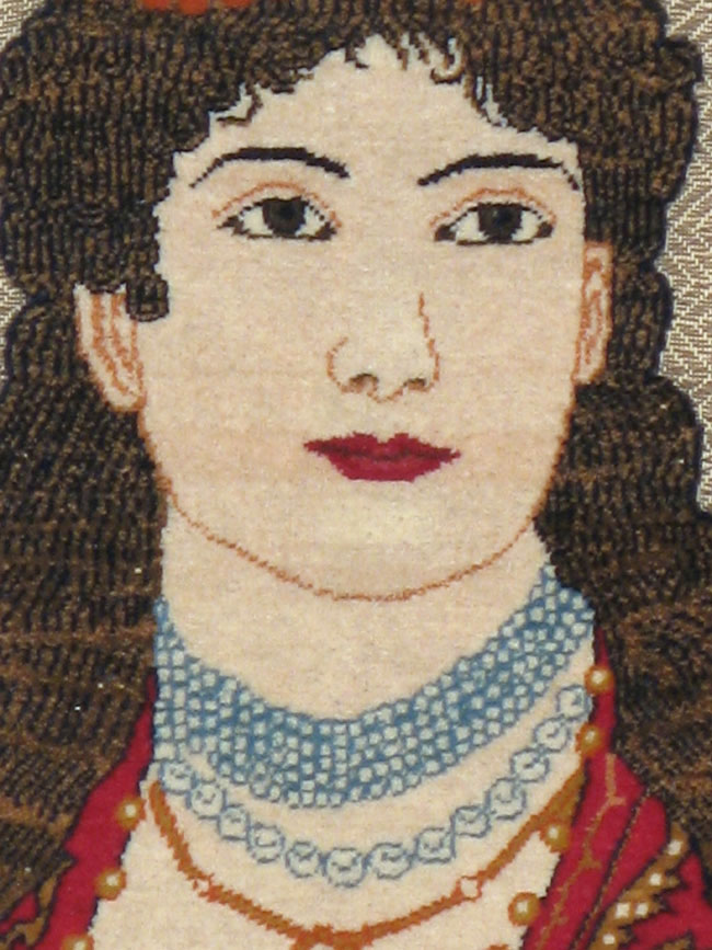 A bejeweled and buxom lady stares straight out at the viewer. Her long wavy brown hair reaches well past her shoulders. The image derives from a European print. The drawing is well-executed and the background has been reduced to a neutral small herringbone pattern. A vintage rug that can make a great pillow face for a boudoir.