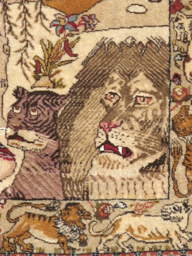 A vintage Persian Tabriz Pictorial rug. This urban picture rug contains two scenes from the Khamseh (Five Poems) of the famous 12th century author Nizami. Below is the love-crazed Majnun among his animals with his beloved Layla arriving on her camel to the right. Above is the princess Shirin on horseback and her admirer, the sculptor Farhad. Neither tale ends well, but the rug is well executed in a charming style. A beige border of lions and panthers surrounds the whole.