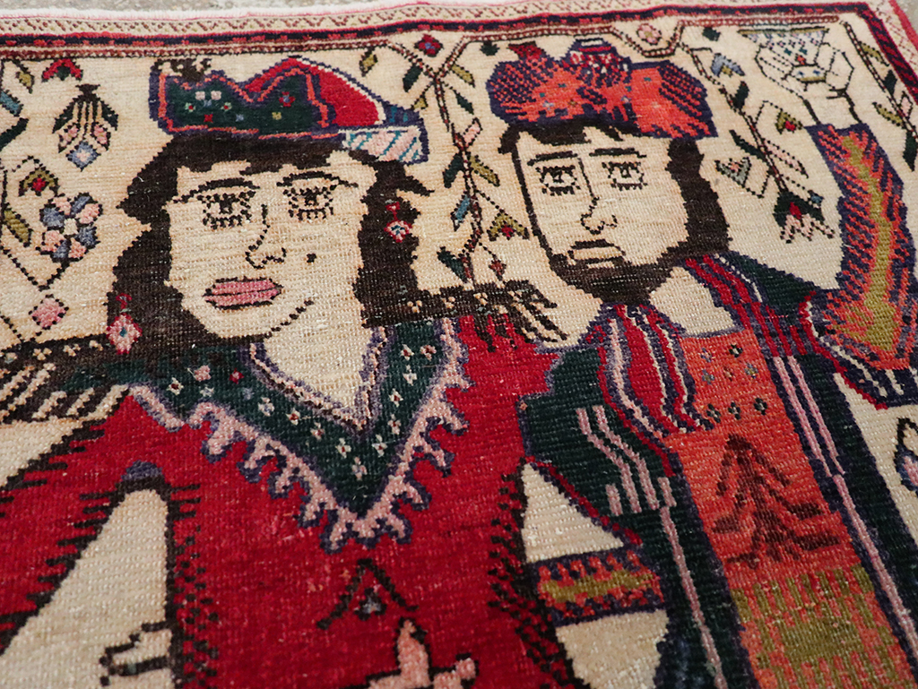 A vintage Persian Tabriz Pictorial rug. An ivory ground with a trailing tendril and leaf décor sets off the dancing female and male couple in colorful traditional Persian folk costume. Obviously having a good time, they advance from left to right. The drawing is rustic and untutored, but the weave is quite fine.