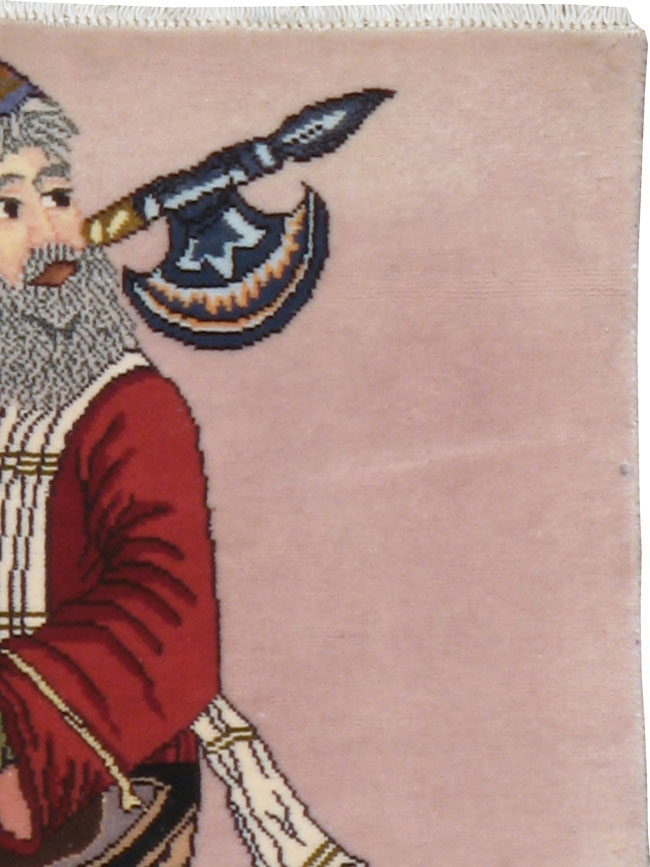 A vintage Persian Tabriz Pictorial rug. A bearded, long-haired dervish heads left, but turns his head to the right against a plain ground with low leafy, flowering plants in front and behind. He carries a typical dervish axe, tea pot and begging bowl (kashkul) and is stylishly, though tattered, attired. The weave is fine and the image must have a print or painted original.