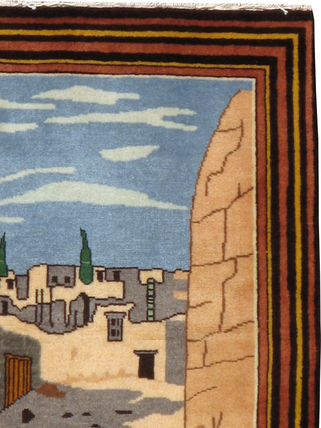 A vintage Persian Tabriz Pictorial rug. Along a dusty lane in a mud walled village, two riders with horses and a donkey are viewed from behind as they head toward the town center. The blue sky above displays white cirrus clouds. The numerous, plain borders give this finely woven urban pictorial the look of a painting.