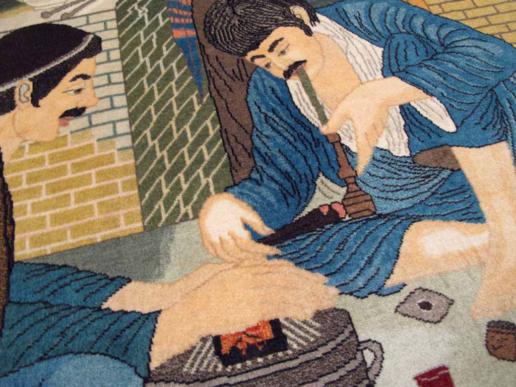 A wool pile of symmetric knots on a cotton foundation. Four male figures get stoned in an opium den, smoking away, with a samovar, lamp, and two tea pots on a raised brick platform behind. Brick walls all around. A lunchbox and glasses of tea are laid out in front. Saturated colors. One figure has already passed into dreamland.