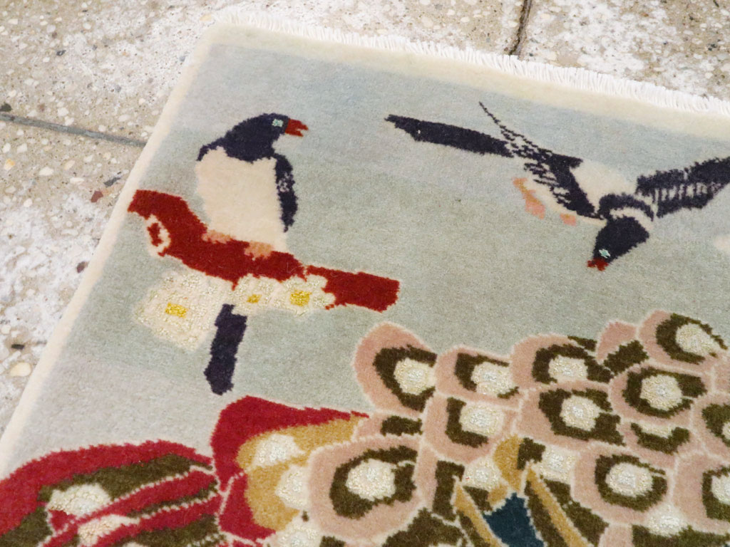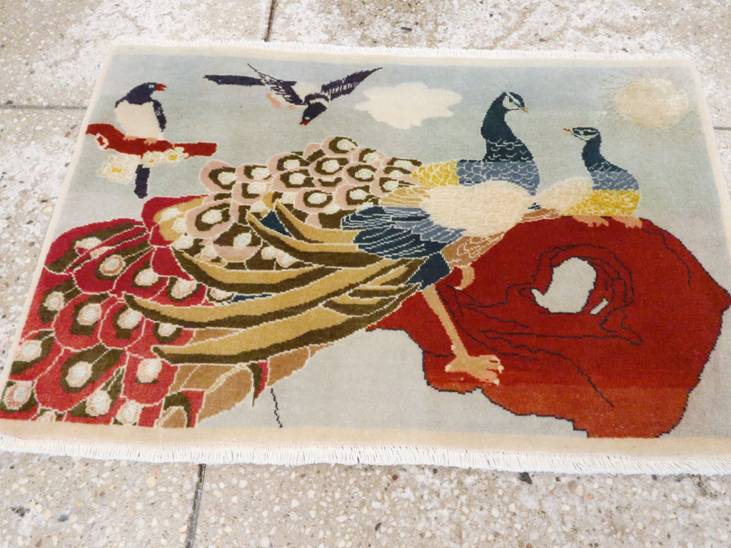 A wool pile of symmetric knots on a cotton foundation. A lavishly plumed peacock stands on a red rock facing right, accompanied by two smaller birds, all set against a pale blue sky dotted with fluffy clouds. The vibrant peacock dominates the composition. A narrow, plain cream-straw border frames the design.
