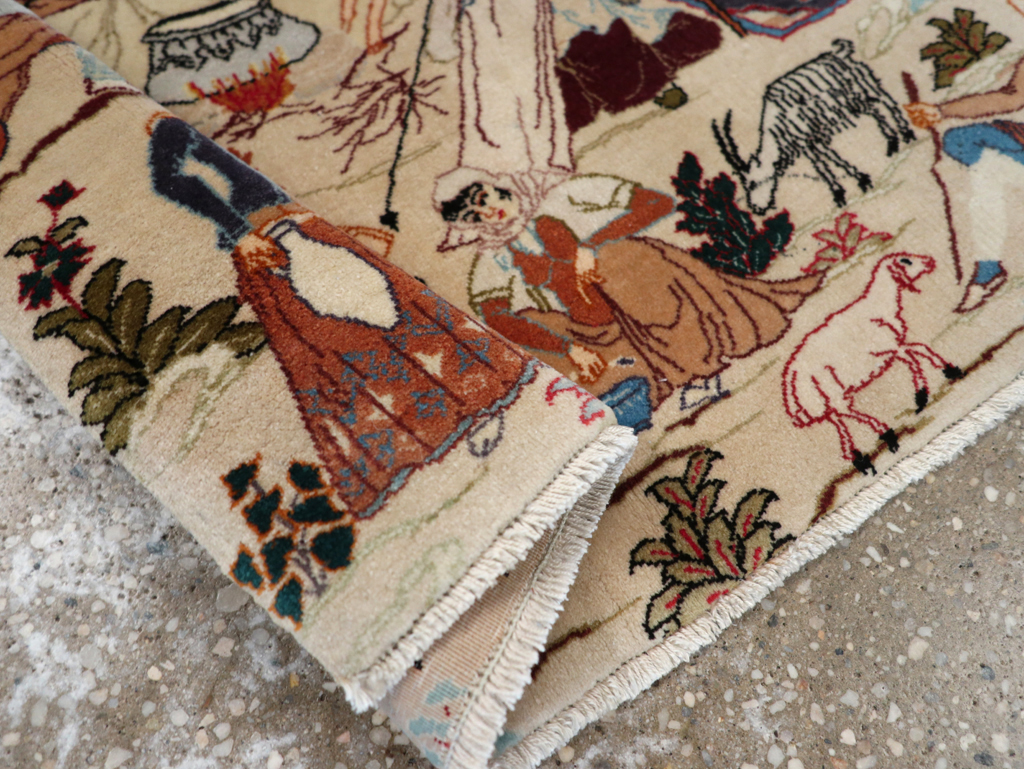 A wool pile of symmetric knots on a cotton foundation. Against a pale blue sky, a busy nomad encampment of tents displays various domestic pursuits including cooking soup, carrying water, cutting firewood, feeding the baby watching the sheep and washing clothes. Tabriz is a large urban conglomeration, but this rug shows what it means to be a nomad. Sand ground shows off the hard working women.