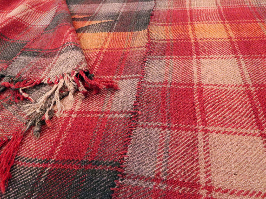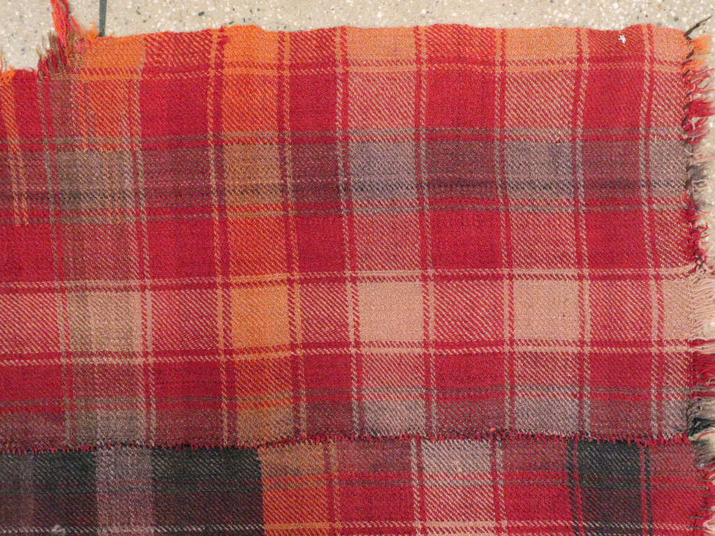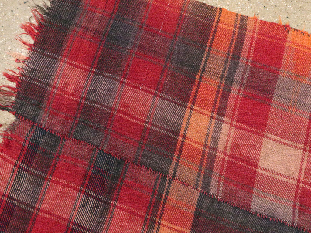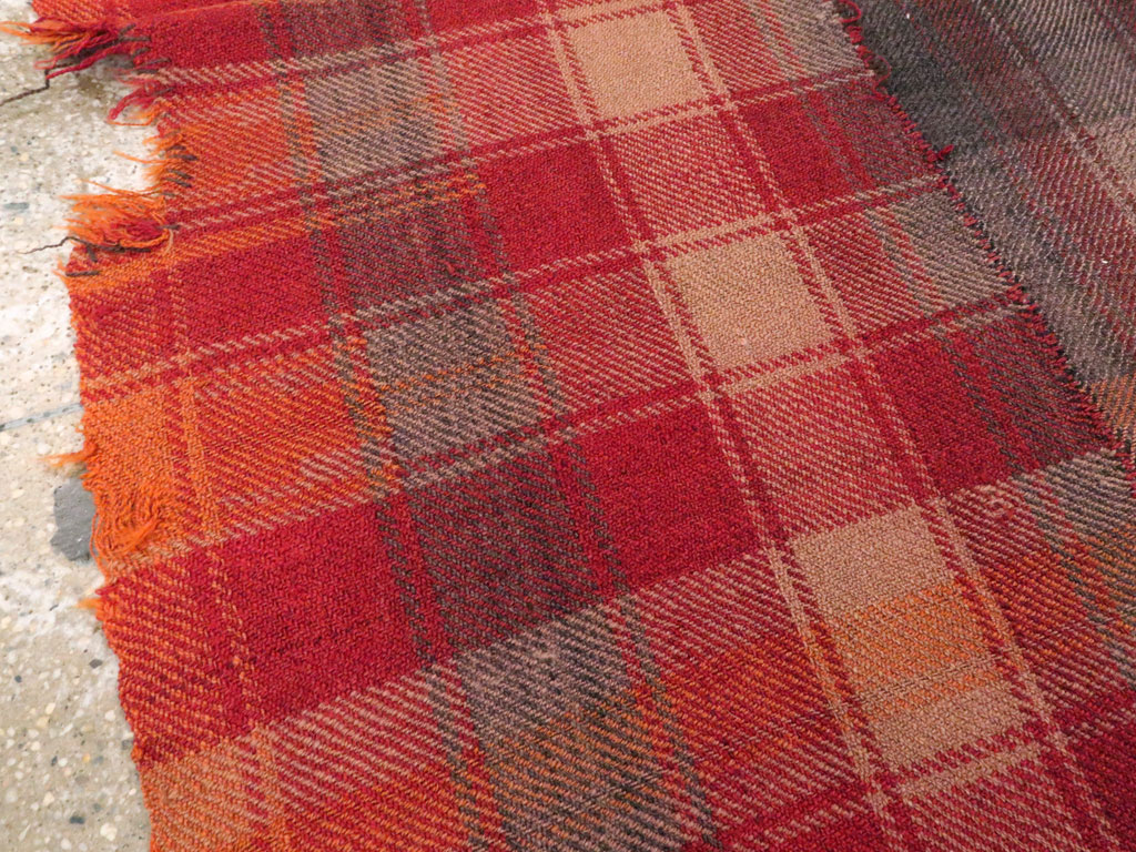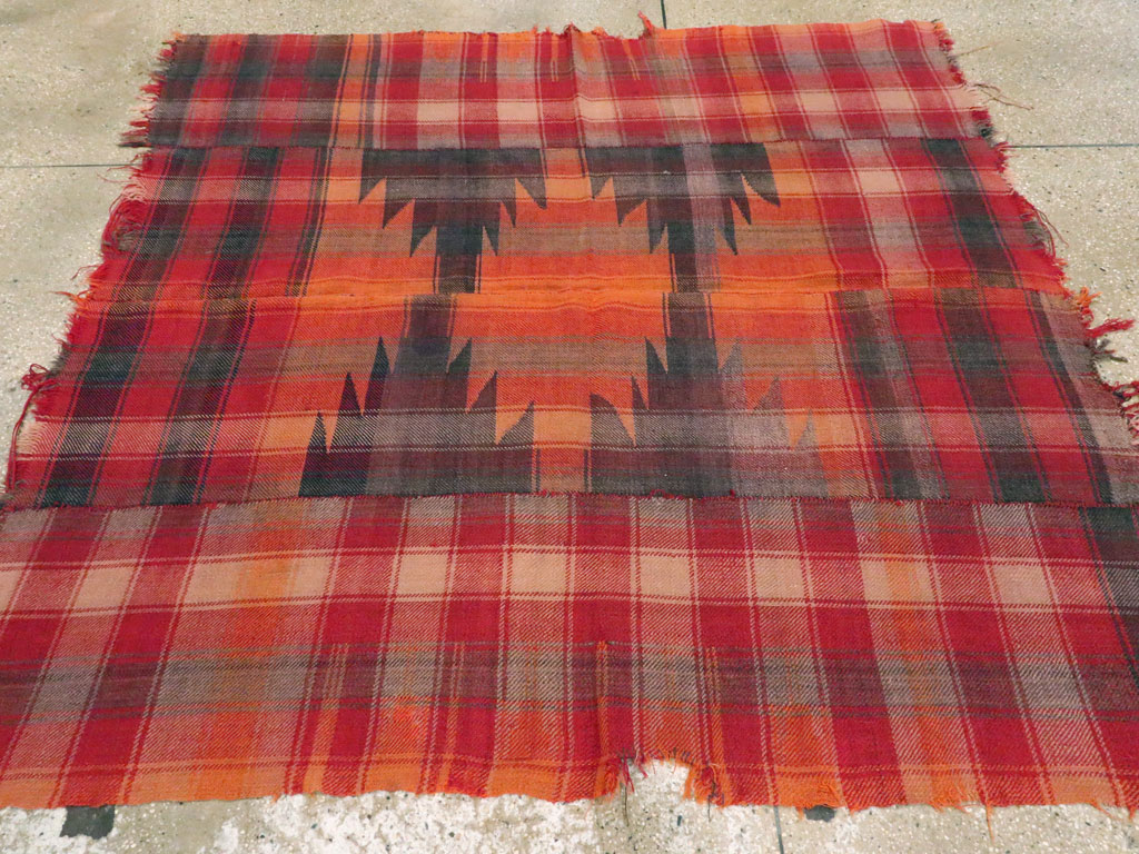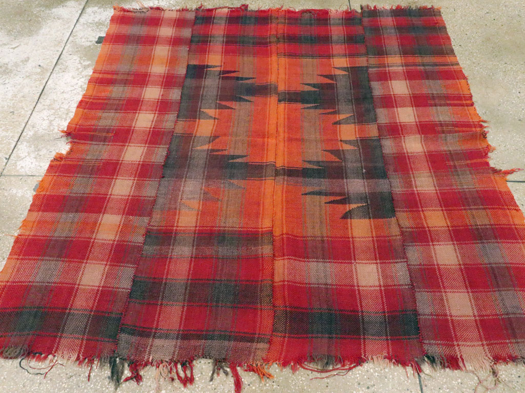 A vintage Persian Textile. In unconserved, as found, condition, this four panel village cover has a jagged lozenge pattern in its central panel and a wide plaid border. Reds, orange and beige are among the important tones.