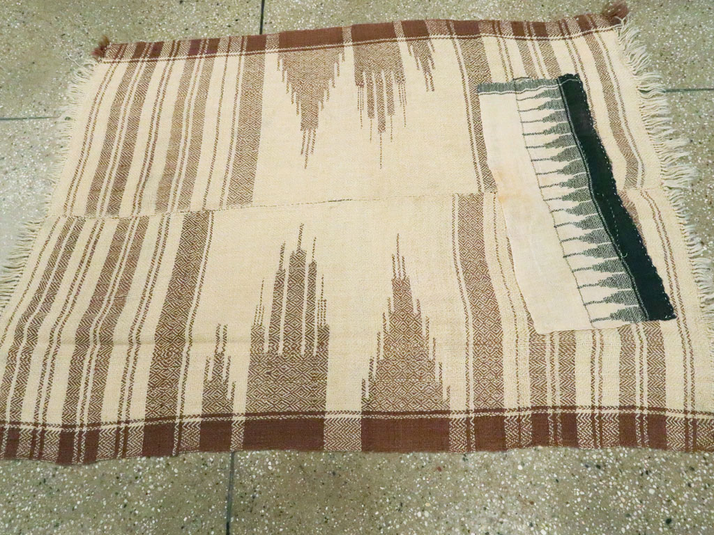A vintage Persian Textile. This rustic two panel small cover is decorated I beige and grey-brown with a jogged central seam and a section of black, blue and ivory flatweave added as a repair. The panels can be re-ordered for a more continuous design.