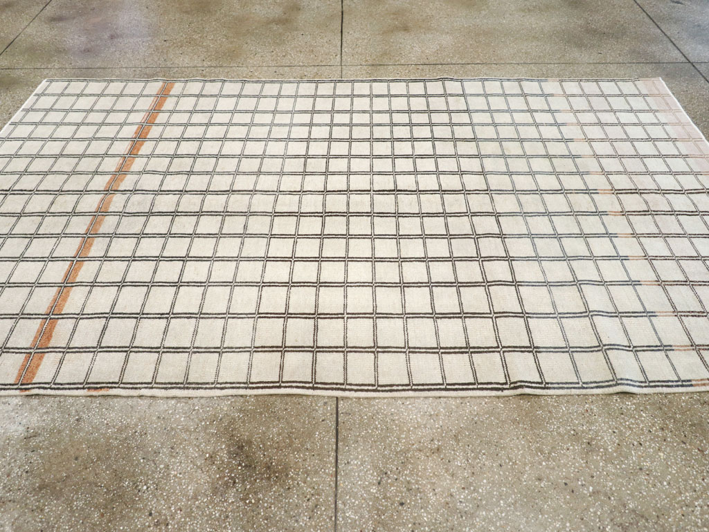 A wool pile of symmetric knots on a cotton foundation. The straw-ecru field shows a formal, square allover gridwork in charcoal, enlivened with a narrow light rust-brown band across, about ¼ from one end. The defining lines are doubled throughout. No borders, but size adjustable. Two narrow runners, for example.
