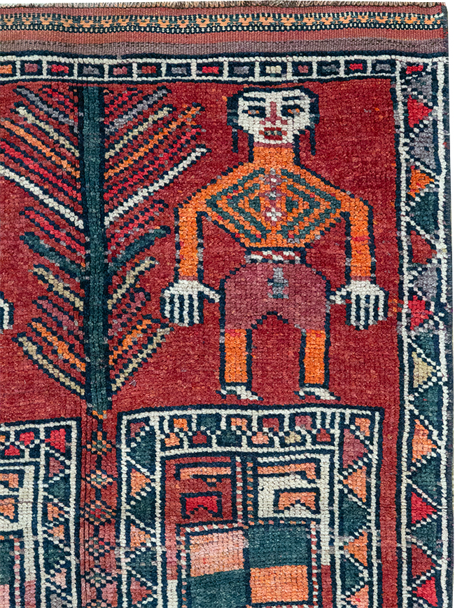A wool pile of symmetric knots on a wool foundation. The red field is divided into two similar columns with male human figures alternating with rectangles enclosing smaller quartered rectangles with T-shaped extenders. The figures have the same outlines and execution, but their garb differs in color. Ivory border with a polychrome triangle mosaic pattern. Wide stripe plain weave end finishes.