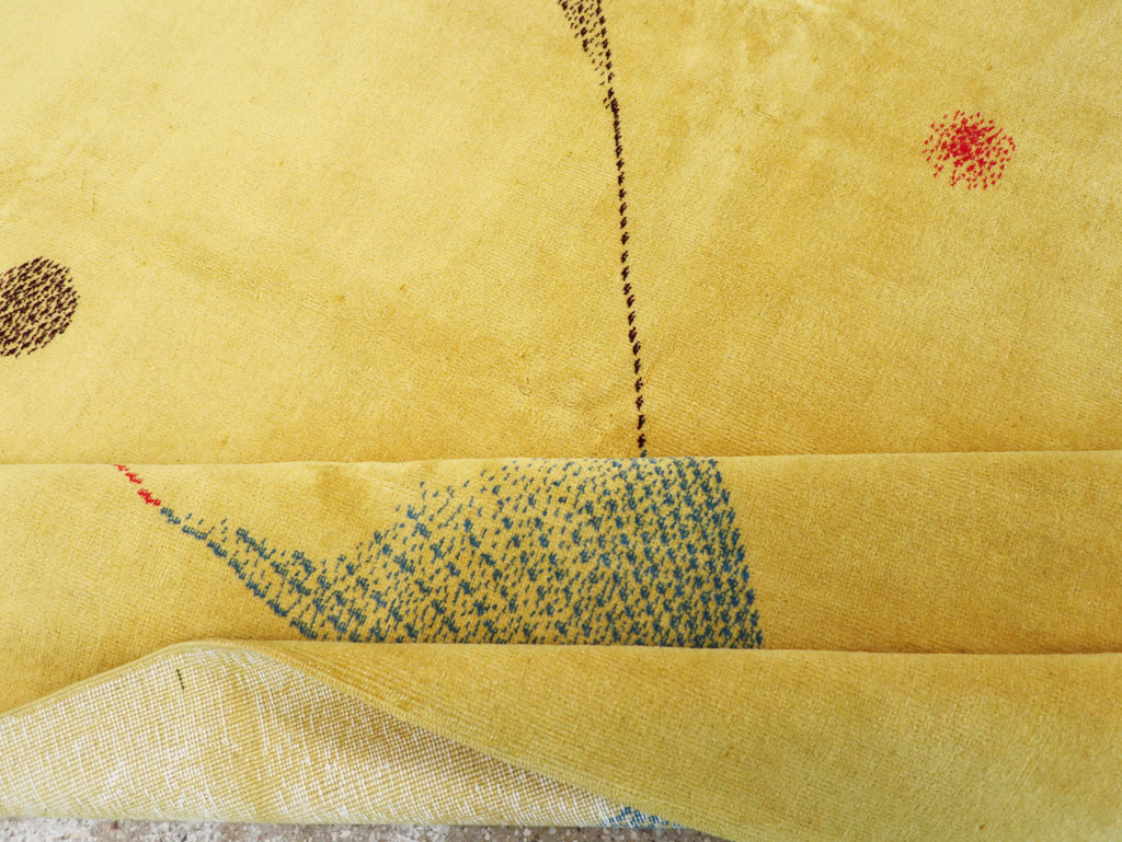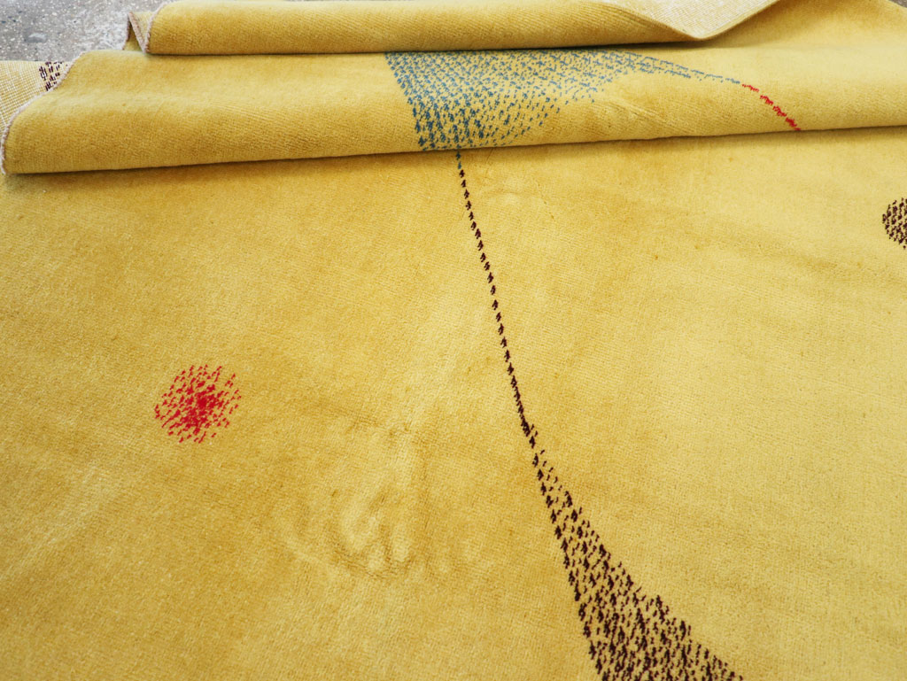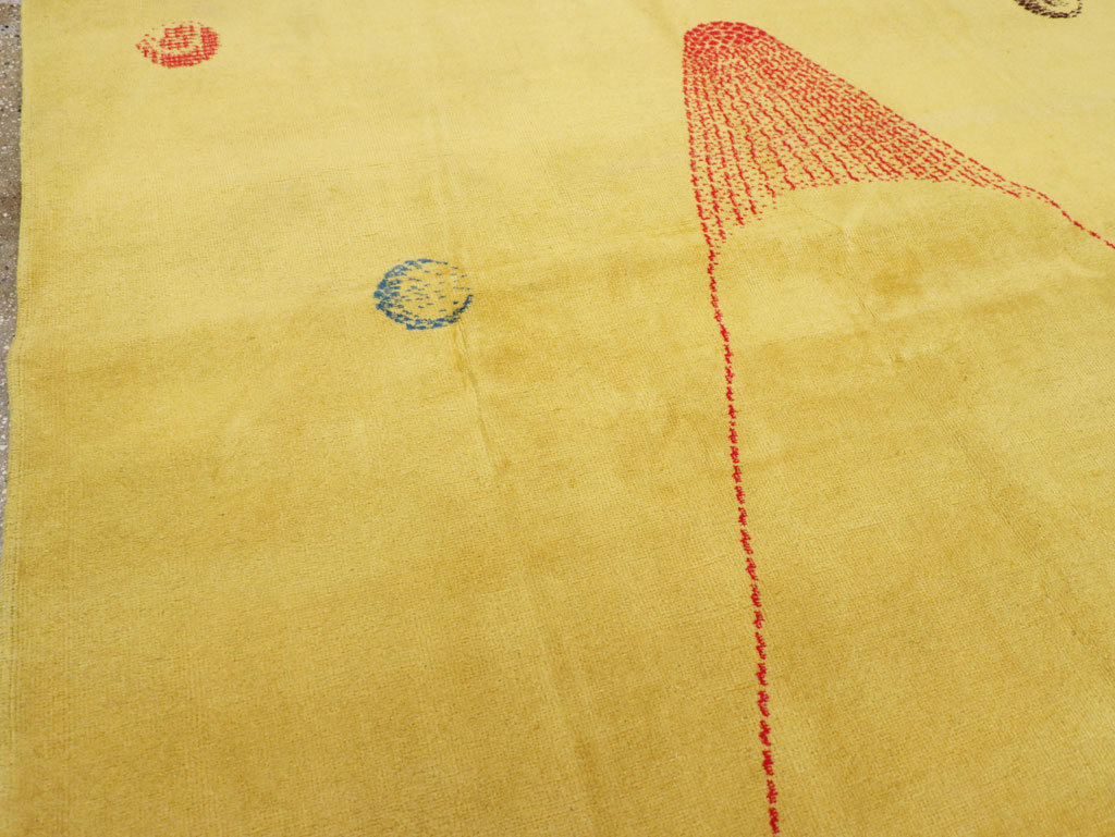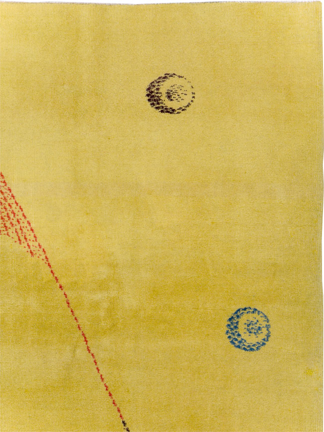 A wool pile of symmetric knots on a cotton foundation. This 50’style minimalist piece shows an open triangular motif with shaded and rounded corners, set amongst discs, crescents and stars, all on a crisp canary yellow borderless ground. Thick pile. Totally unusual eye-catching palette. Looks Fifties.