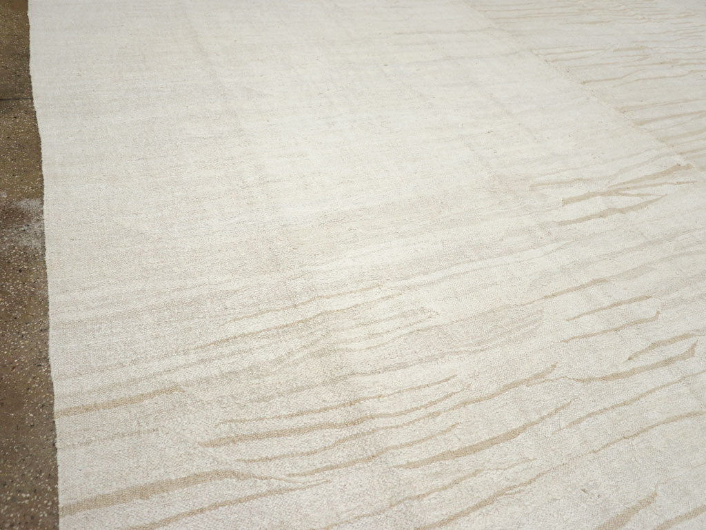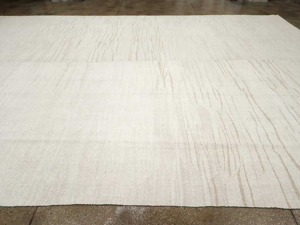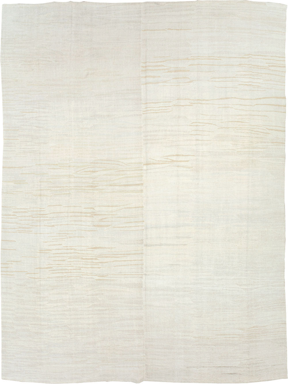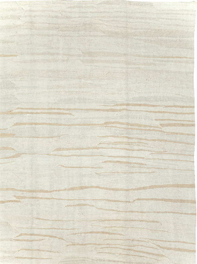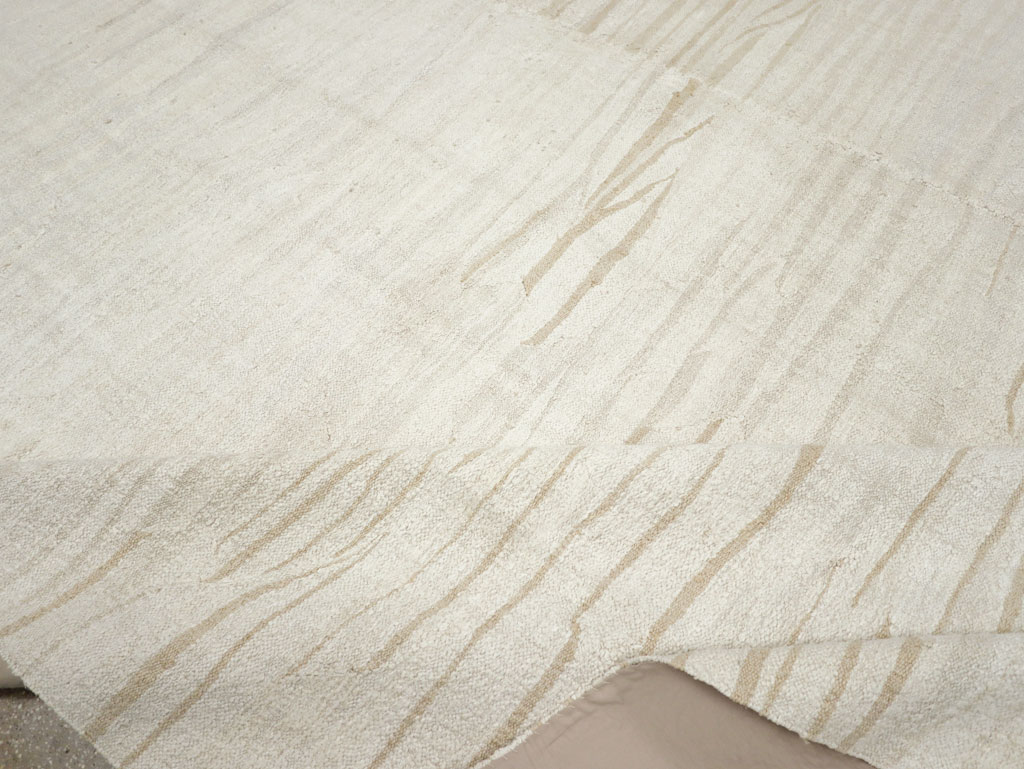 Wool pattern wefts. This two-piece, reduced-palette rustic flatweave is perfect for a country home. The two sections feature distinct patterns of broken, intermittent 'tiger stripes' in shades of soft brown on subtly varied straw grounds. The stripes wind and waver across the sections, which are edge-joined along the central axis. The size is adjustable. This large flatweave is incredibly hardwearing, and local Persian villages use the halves, joined or separate, as floor coverings or as mobile furniture and covers.