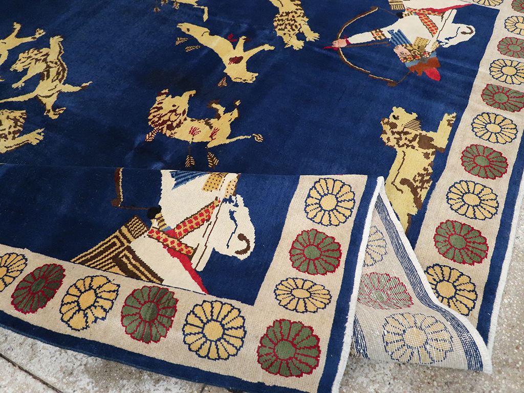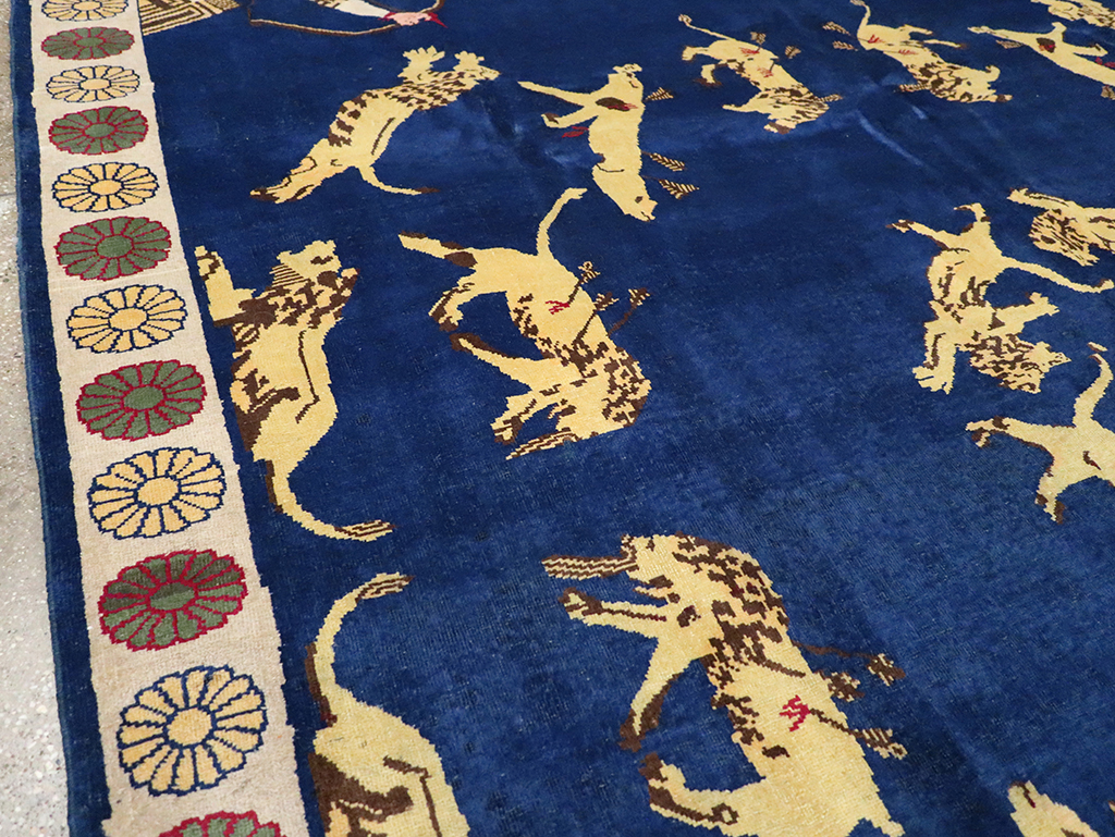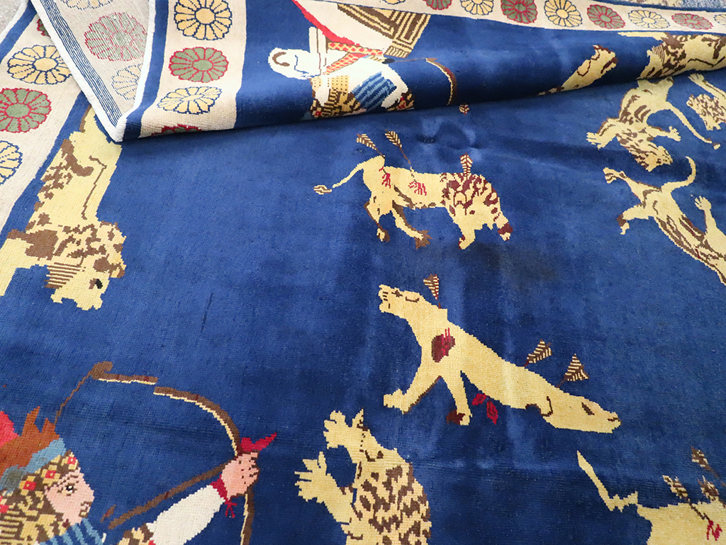 A vintage Turkish Kurd Pictorial rug. The dark blue ground of this finely woven pictorial carpet features four corner Achaemenid-style ancient Persian archers in half -length taking aim with drawn bows at a circle and center of tawny lions, some wounded by arrows, and pairs couchant at the cardinal points of the carpet. The narrow ivory border displays rosettes in yellow and red. The wounded lion appears on ancient Achaemenid stone relief.