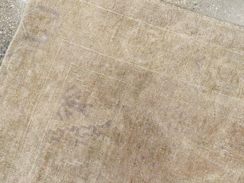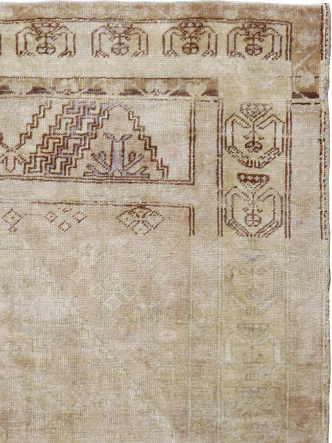 A vintage Turkish Oushak rug. This long Turkish scatter may have been woven closer to central Anatolia. The colors are primarily tone-on-tone brown and beige, but there is a stretch at one end where sienna brown outlines delineate stepped triangles.