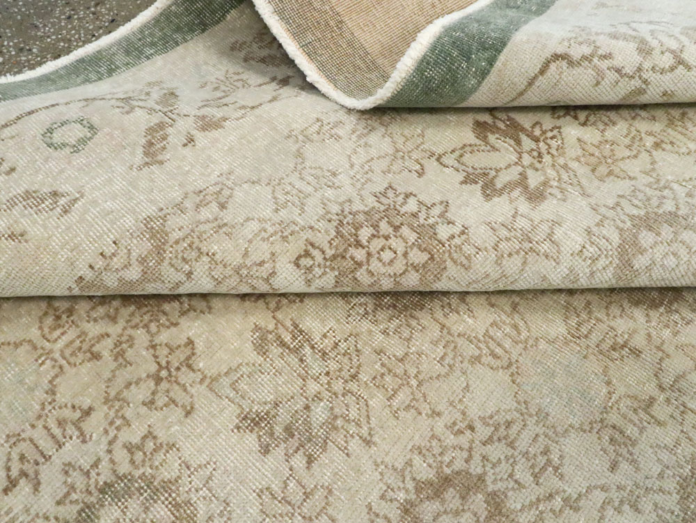 A vintage Turkish Sivas Distressed rug. The plain medium brown outer border makes a neat frame for the lacy, leafy Mina Khani pattern on the ecru field of this eastern Turkish city room size carpet. There is a light pattern abrash toward one end of the field. The old ivory border displays rosettes and long-slanted acanthus leaves. The general tonality is light and mellow. The plain outer border adds a definitive frame to the whole.