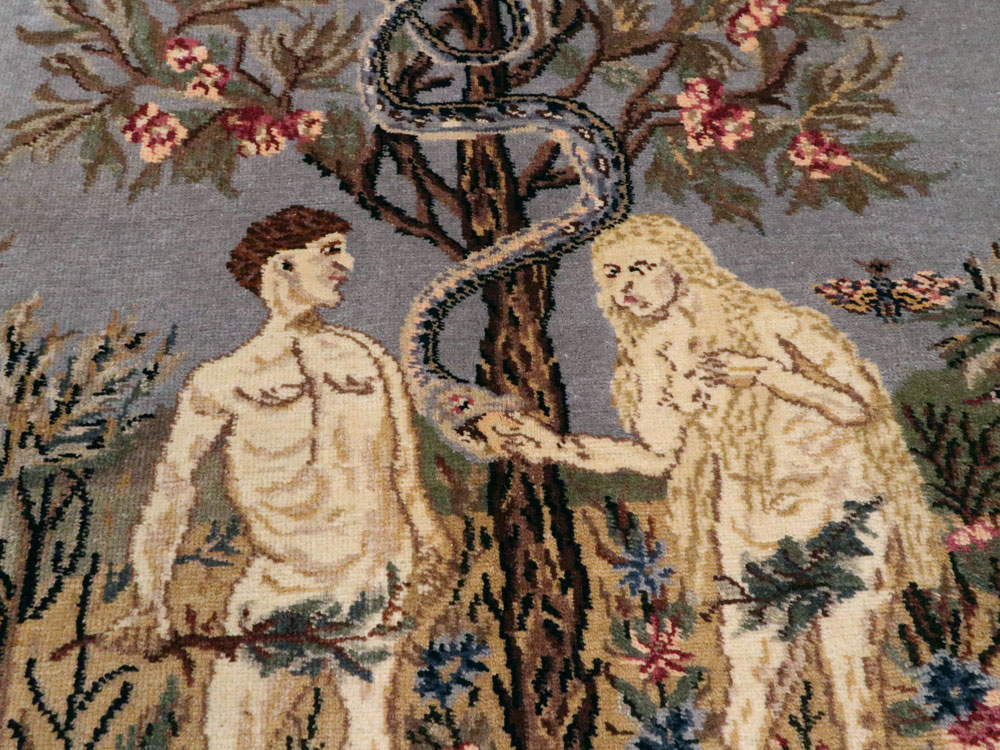 A vintage Turkish Sivas Pictorial rug. Adam and Eve, basically nude, the snake, the Tree of Good and Evil, and the apple, in the Garden of Eden with an assortment of miniature animals among the verdant foliage, including a lion, a bear (?), a rooster and a horse. More animals, including camels and ostriches (!), inhabit the navy border. A city rug was taken from a European print.